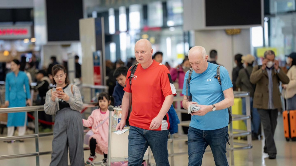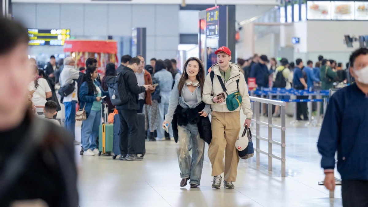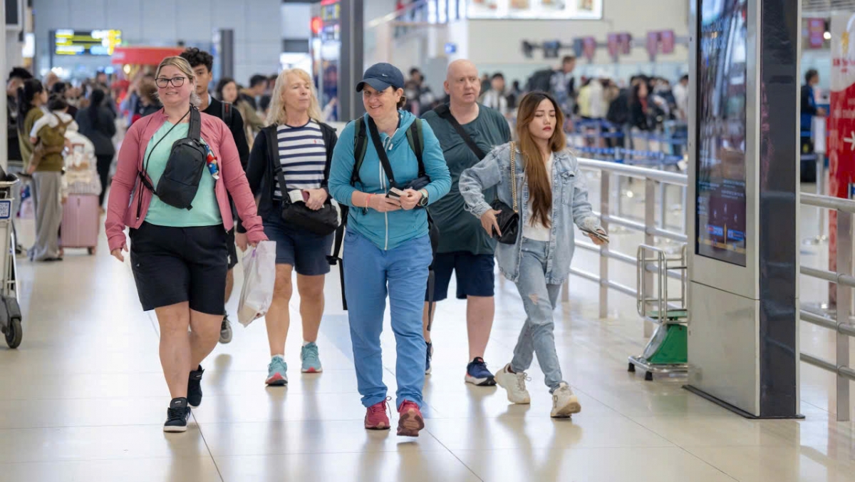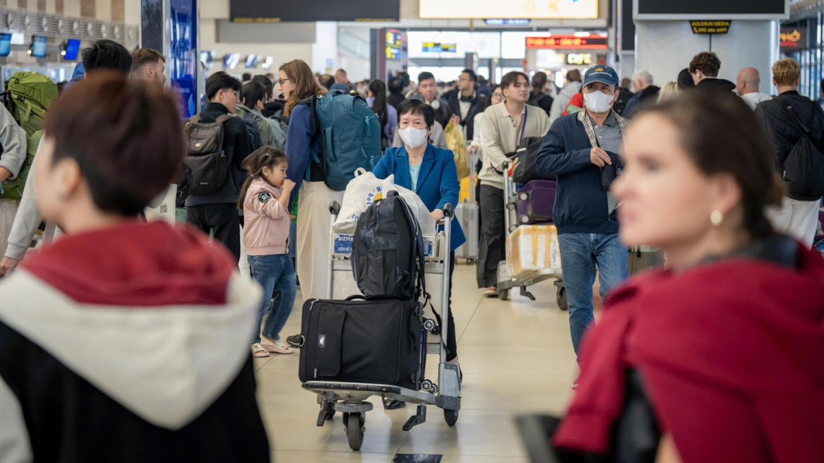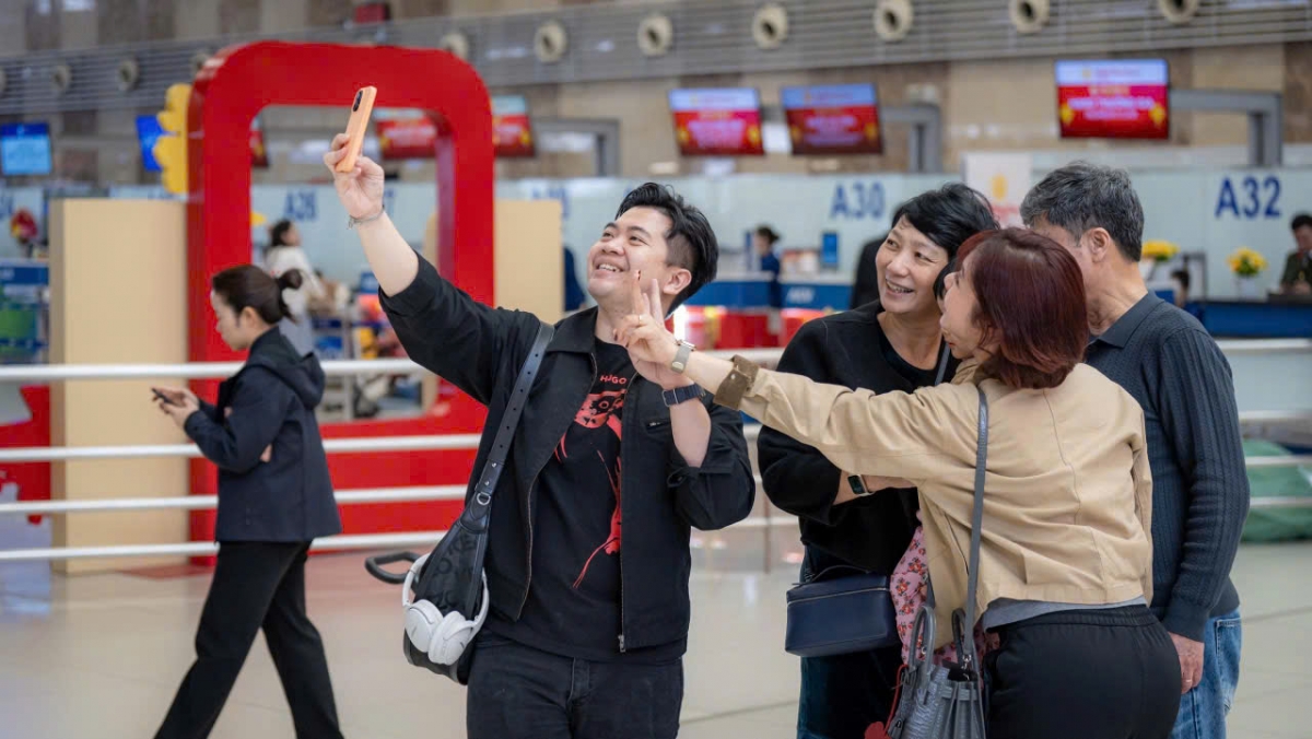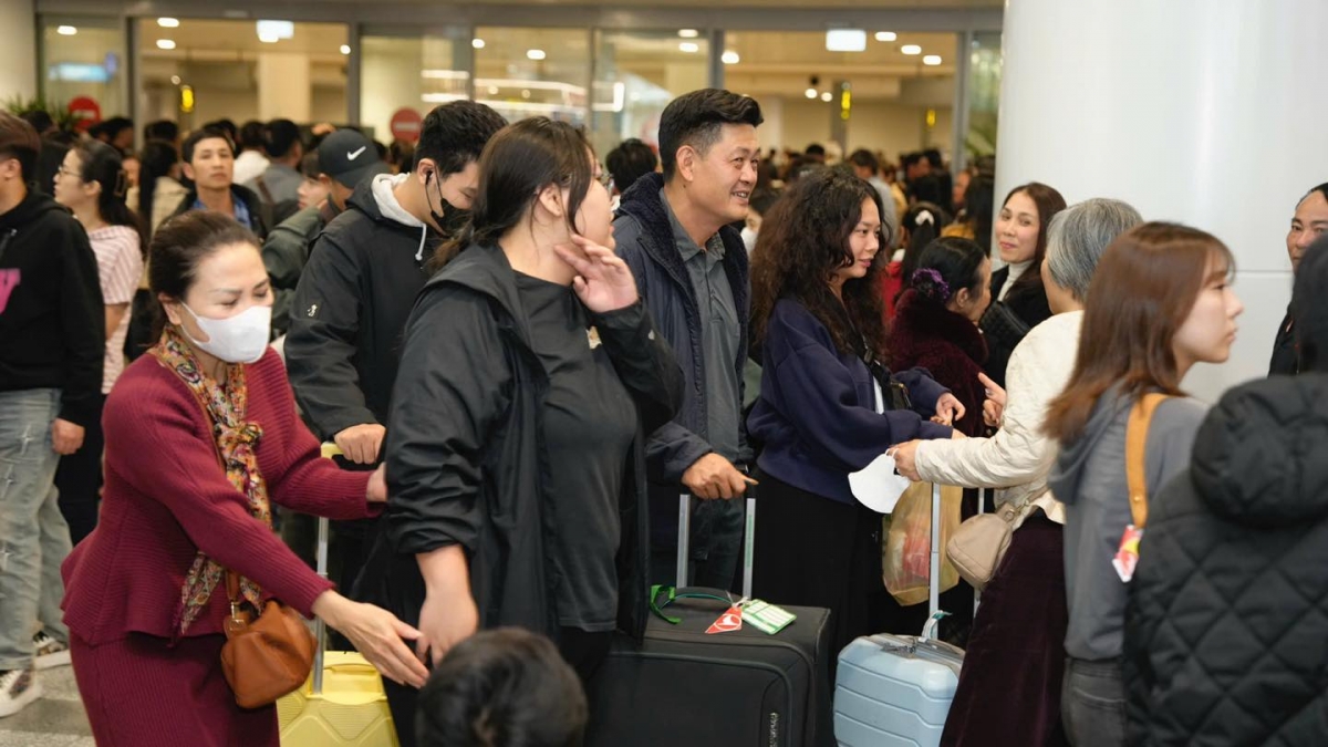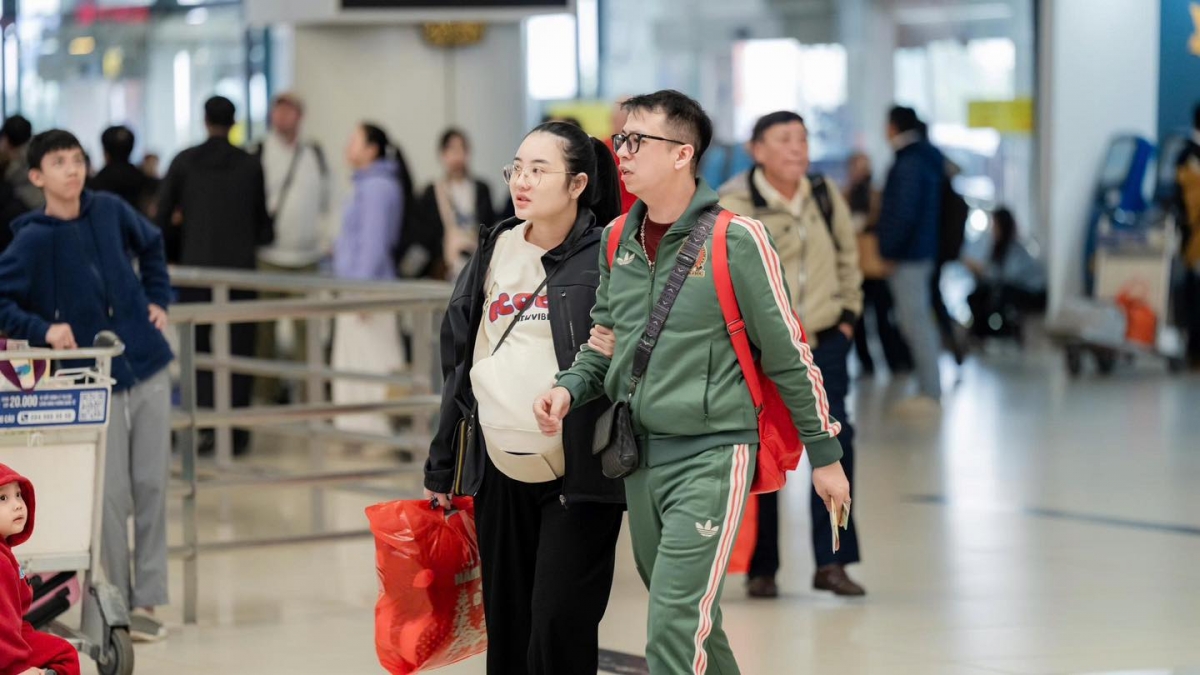 Một nhóm hành khách vừa đáp xuống Sân bay Nội Bài để chuẩn bị du Xuân, tận hưởng không khí Tết miền Bắc.