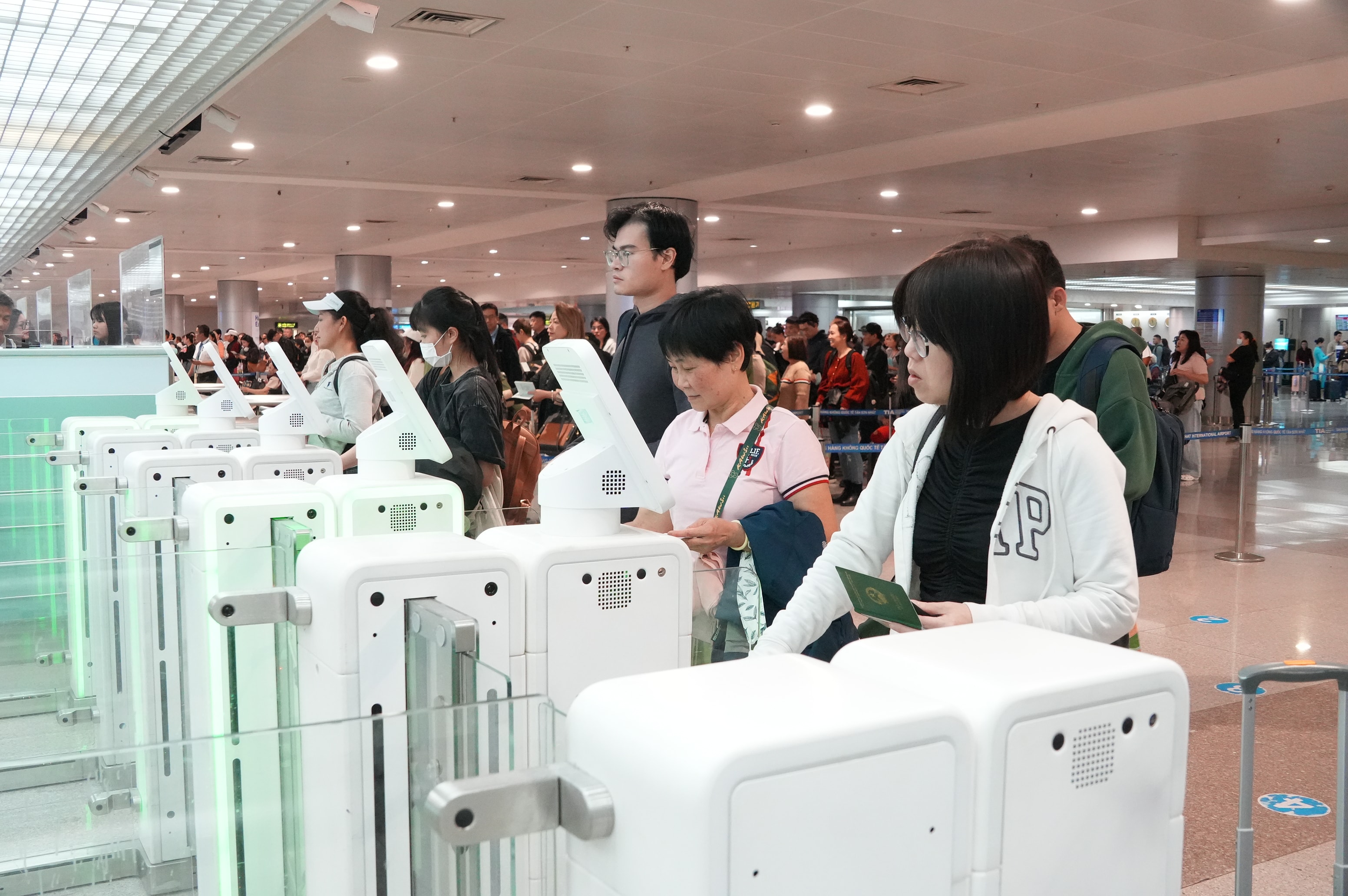 Hành khách làm thủ tục bằng hệ thống tự động tại Cảng hàng không quốc tế Tân Sơn Nhất. Ảnh: Thạc Hiếu