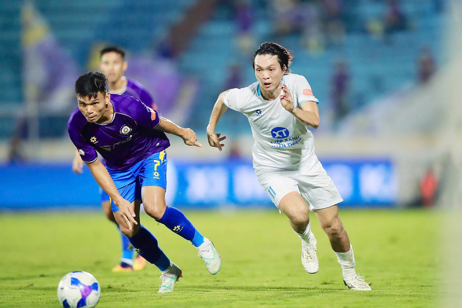 Tuấn Anh (phải, CLB Nam Định) đua tốc độ với cầu thủ CLB Hà Nội ở vòng đấu thứ 11 V-League 2025-2026. ẢNH: P.MINH