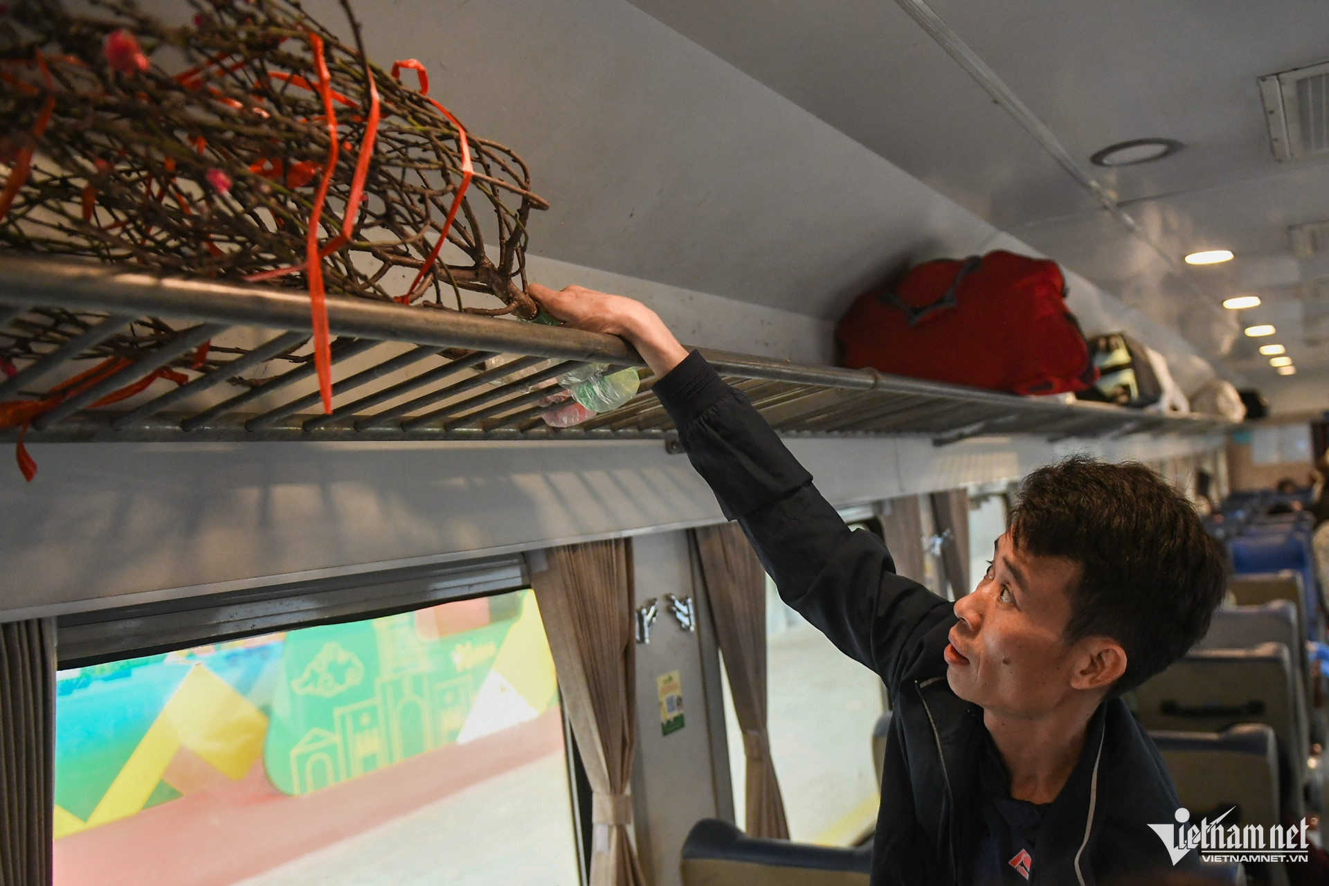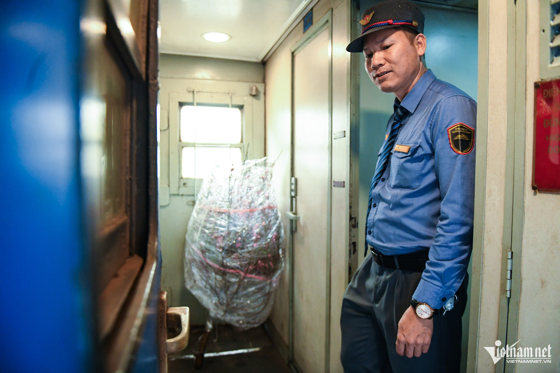 Hoa đào, quà Tết… trở thành những “hành lý đặc biệt” theo chân hành khách lên tàu dịp cuối năm. Những cành nhỏ được khéo léo đặt cạnh chỗ ngồi, còn cành lớn được nhân viên nhà ga hỗ trợ sắp xếp ở cuối toa.