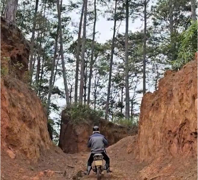 Tại khu vực lân cận, nhiều hố sâu còn sót lại từ các đợt đào trước, có hố sát ngay gốc thông. Với địa hình dốc, đất đỏ bazan dễ sạt trượt, việc múc đất sát gốc khiến cây mất liên kết, chỉ một trận gió mạnh cũng có thể gây đổ hàng loạt.
