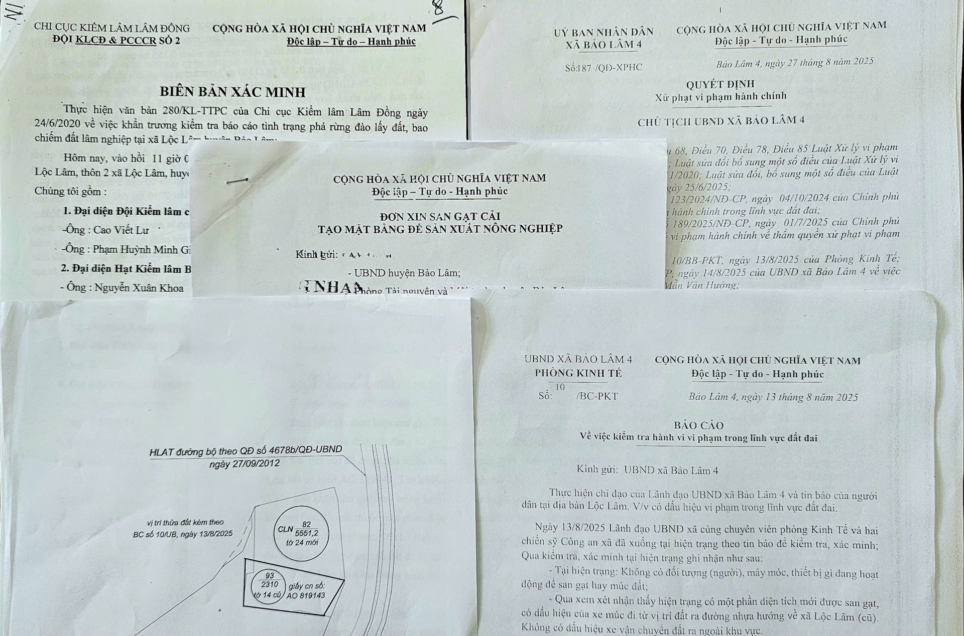 Theo báo cáo kiểm tra hành vi vi phạm trong lĩnh vực đất đai của Phòng Kinh tế, làm căn cứ để Chủ tịch UBND xã Bảo Lâm 4 ra quyết định xử phạt hành chính vào tháng 8/2025 như đã nêu trên, ghi rõ: “Căn cứ tọa độ ghi nhận tại hiện trạng thì vị trí san gạt là thửa đất số 93, tờ bản đồ số 14 (nay thuộc thửa đất số 82, tờ bản đồ số 24 Lộc Lâm) thuộc quy hoạch hoạch đất ở nông thôn và đất nông nghiệp. Chủ sử dụng đất là ông Mẫn Văn Hưởng và bà Tạ Thị Kiều - Thôn 3 Lộc Lâm”.