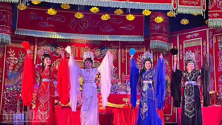 Các nghệ sĩ Nhà hát nghệ thuật Hát bội Thành phố thực hiện lễ Đại Bội trong chương trình giỗ Tổ. (Ảnh LINH BẢO)
