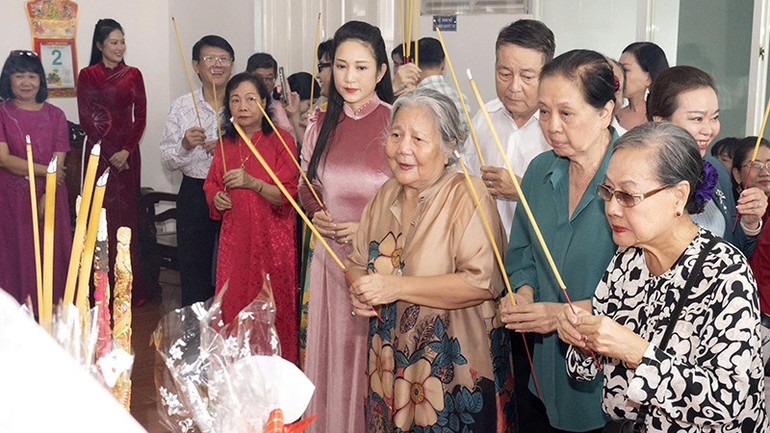 Các đại biểu thắp hương lên bàn thờ Tổ tại nhà thờ Tổ Sân khấu, phường Cầu Ông Lãnh, Thành phố Hồ Chí Minh. (Ảnh: QUỐC THANH)