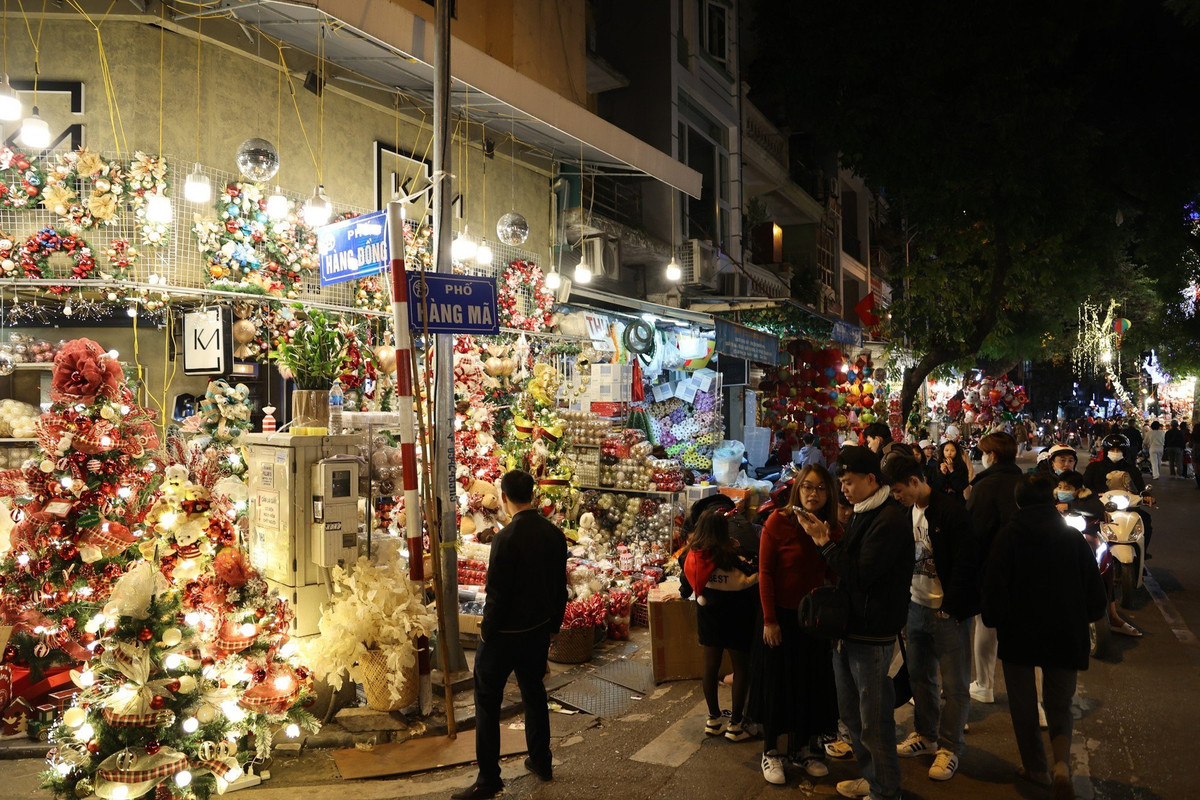 Phố Hàng Mã, trung tâm bán đồ trang trí lễ hội lớn nhất Hà Nội, khoác lên mình vẻ lung linh với vòng nguyệt quế, đèn led và các phụ kiện theo phong cách châu Âu. Tiểu cảnh được dựng ngay trước cửa hàng tạo nên không gian như chợ Giáng sinh thu nhỏ, thu hút đông đảo du khách dạo chơi và chụp ảnh. Ảnh vntravellive