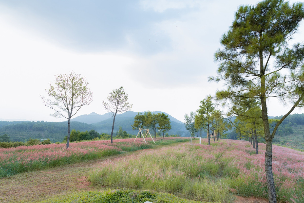 Nơi đây được đưa vào khai thác từ năm 2023, nằm trên khu đất đồi thoải, bao quanh là núi non và rừng keo xanh mướt. Giống cỏ được trồng là loại cỏ hồng có nguồn gốc từ Australia, thích nghi tốt với khí hậu miền Bắc nên sinh trưởng mạnh, tạo nên những thảm cỏ hồng mềm mại trải dài như tấm thảm lụa. Ảnh Quang Nguyễn