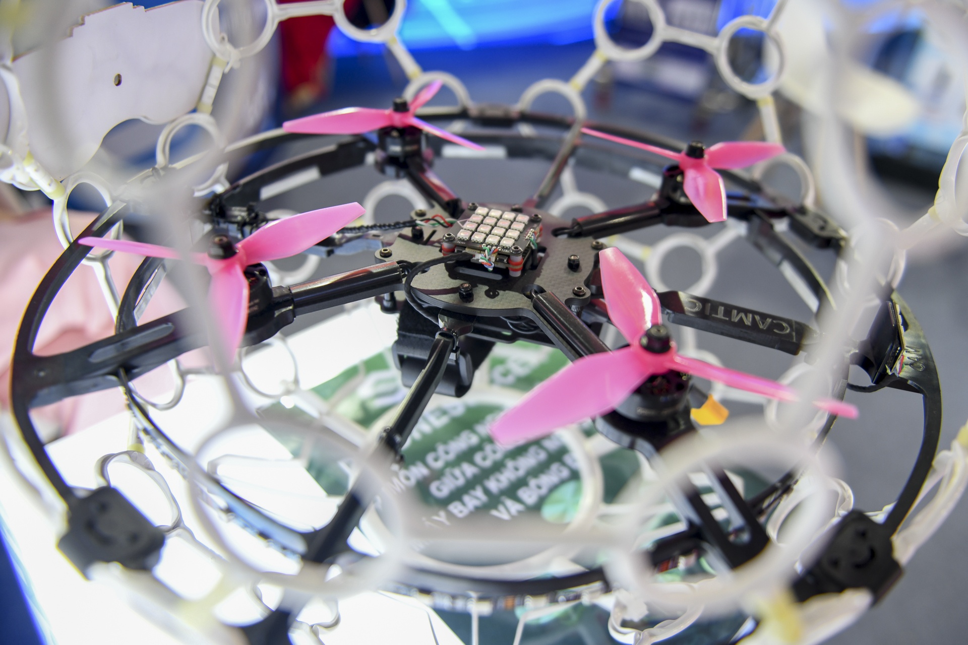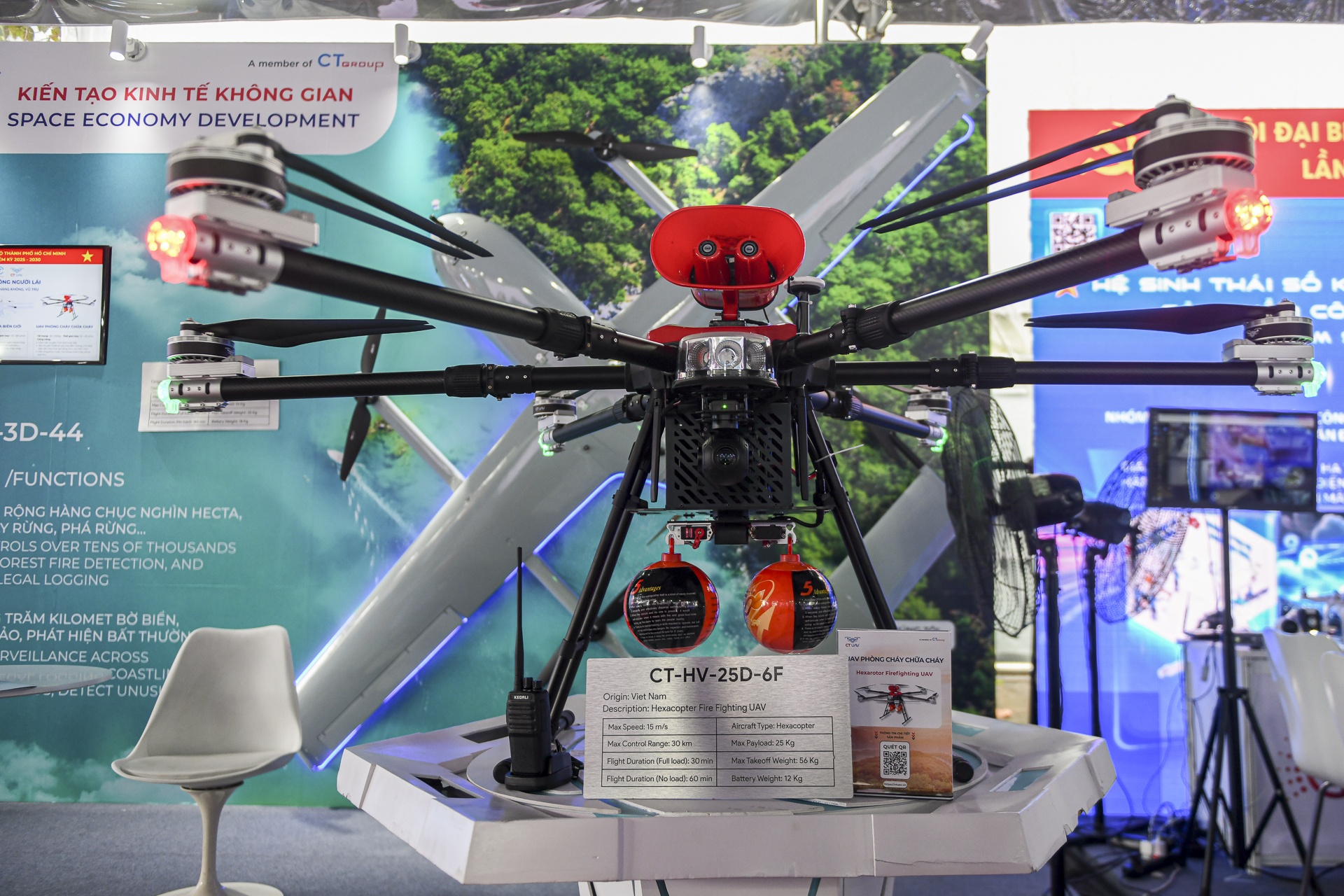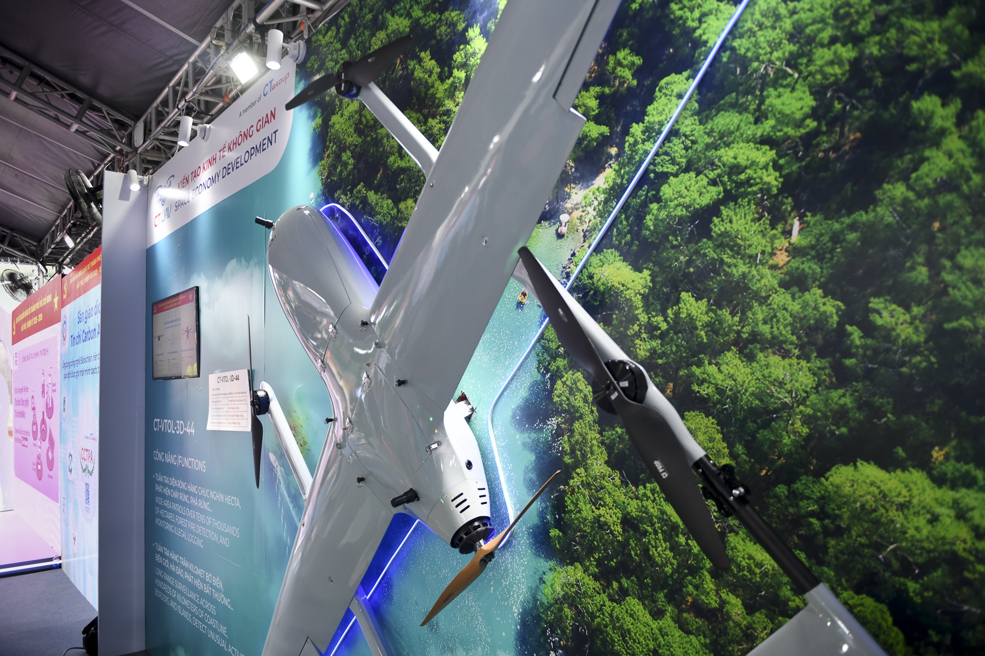 Được giới thiệu là một trong số ít doanh nghiệp Việt Nam có khả năng phát triển hoàn chỉnh và làm chủ 6 nhóm công nghệ cốt lõi trong lĩnh vực máy bay không người lái (UAV), CT UAV (thuộc CT Group) đã mang đến triển lãm các dòng UAV có tính ứng dụng cao như Hexarotor Firefighting UAV chuyên chữa cháy tự động ở hẻm nhỏ và nhà cao tầng (trái); VTOL 4.4m có khả năng tuần tra trên diện rộng hàng nghìn ha rừng và hàng trăm km bờ biển (phải); CT-Spectral 12 kg thúc đẩy nông nghiệp thông minh.