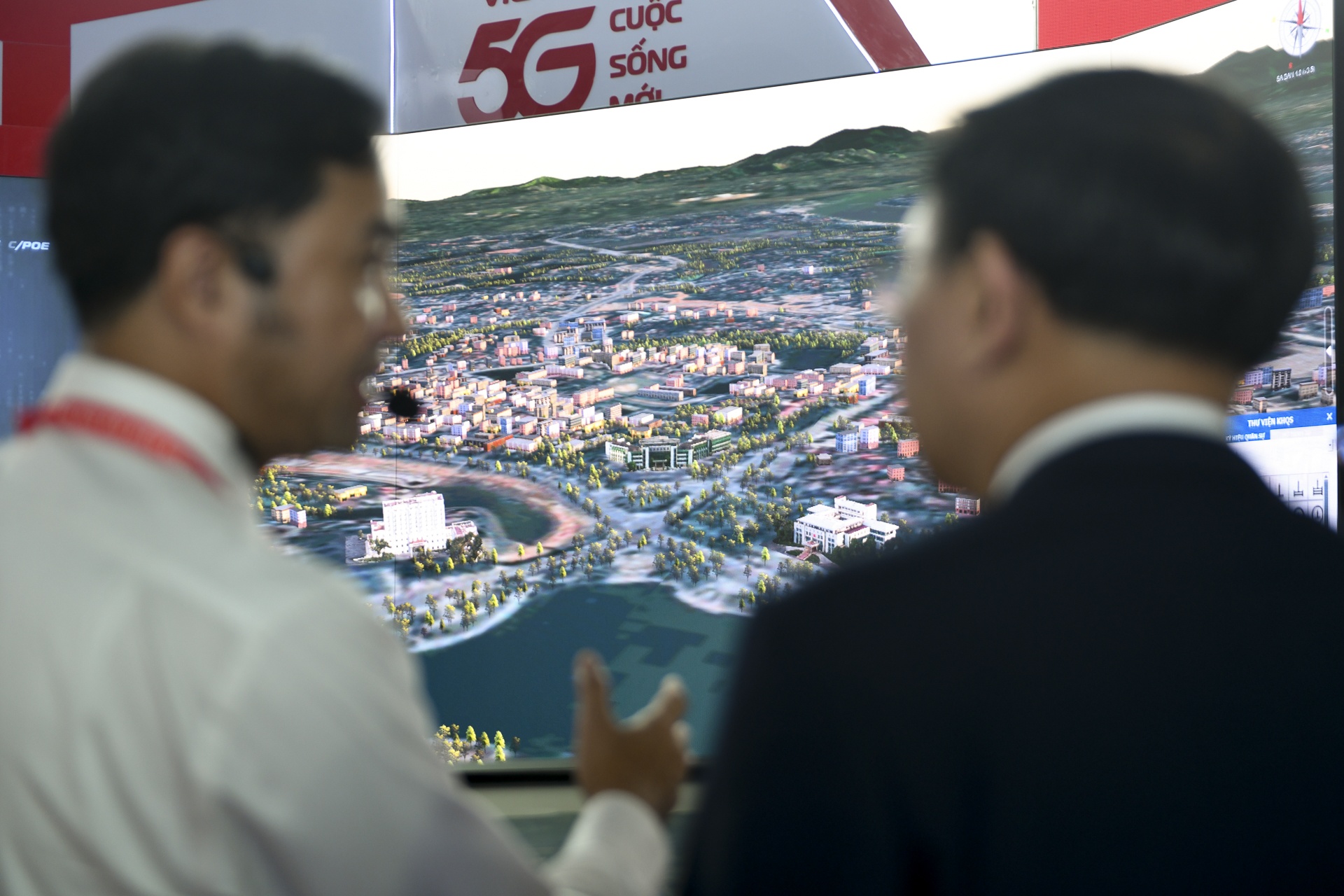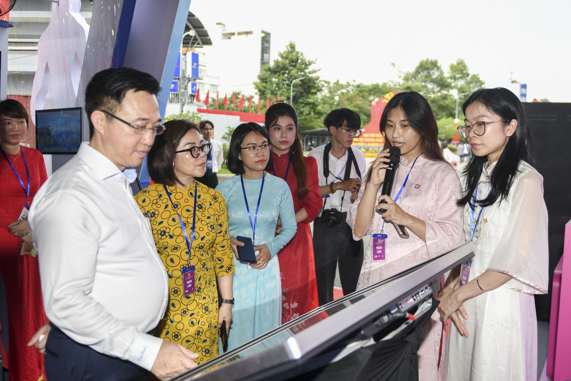 Phó Bí thư Thành ủy TP.HCM Đặng Minh Thông (thứ hai từ trái) và Giám đốc Sở Khoa học và Công nghệ TP.HCM Lâm Đình Thắng (áo đen) tham quan triển lãm ngày 13/10, nghe giới thiệu và trực tiếp tìm hiểu những công nghệ, giải pháp tiên tiến từ các tập đoàn và doanh nghiệp hàng đầu.