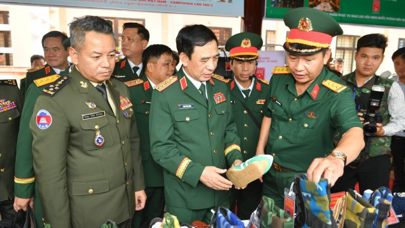 Đại tướng Phan Văn Giang, Bộ trưởng Quốc phòng Việt Nam và Đại tướng Tea Seiha, Phó Thủ tướng Chính phủ, Bộ trưởng Quốc phòng Campuchia cùng các đại biểu tham quan các sản phẩm thời trang do Tổng Công ty 28 (Tổng cục Hậu cần-Kỹ thuật) sản xuất.