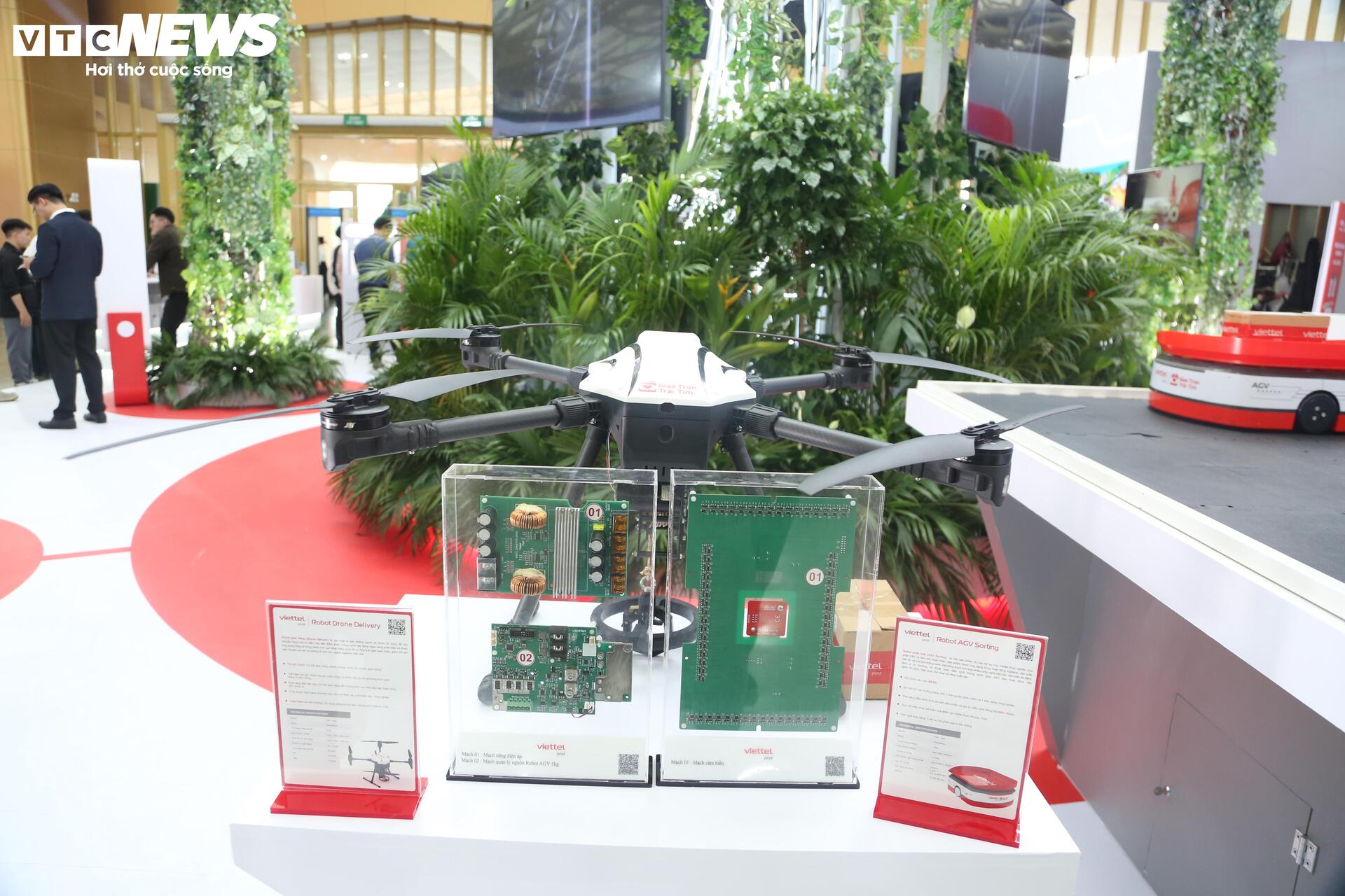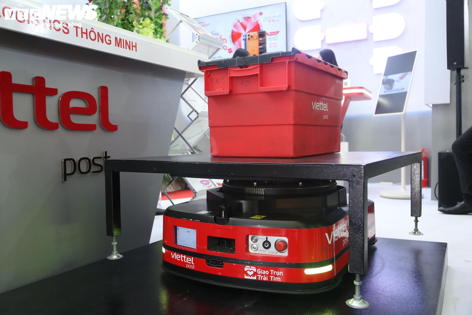 Gian hàng của Viettel trưng bày các sản phẩm Robot Drone vận chuyển hàng hóa, Robot AGV Sorting, Robot AGV Picking dùng trong kho, bãi được chính các kỹ sư Viettel Post nghiên cứu, phát triển và làm chủ hoàn toàn.