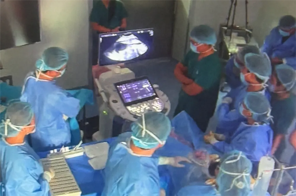 Thời điểm can thiệp, thai nhi được 25 tuần tuổi, nặng khoảng 600 gram, bị dị tật tim bẩm sinh nặng. Các bác sĩ thực hiện kỹ thuật xuyên kim từ bụng mẹ vào tim thai để sửa dị tật.