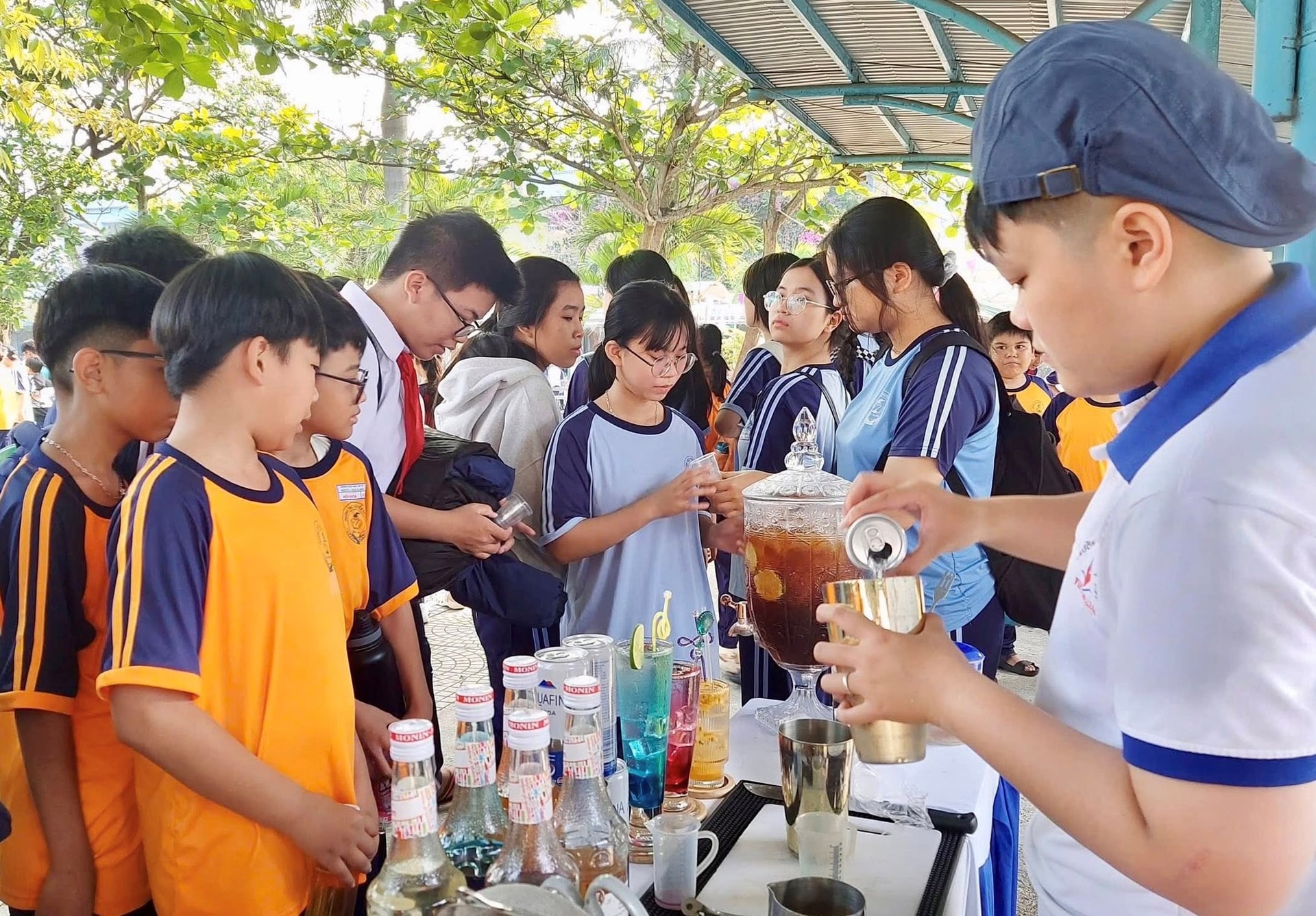 Học sinh các trường THCS trải nghiệm nghề pha chế của Trường Trung cấp Ý Việt. Ảnh: CAO MINH.