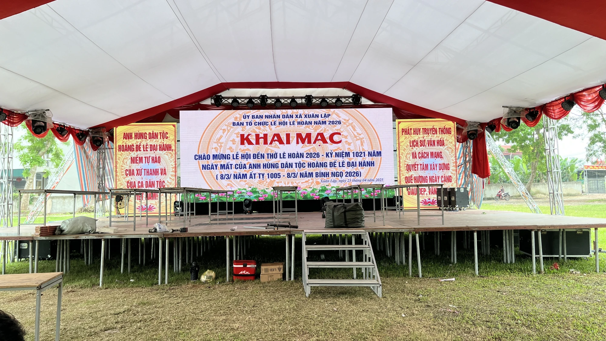 Sân khấu chính phục vụ Lễ hội đền thờ Lê Hoàn năm 2026 tại xã Xuân Lập đã cơ bản hoàn thiện, sẵn sàng cho chương trình khai mạc diễn ra vào ngày mai.