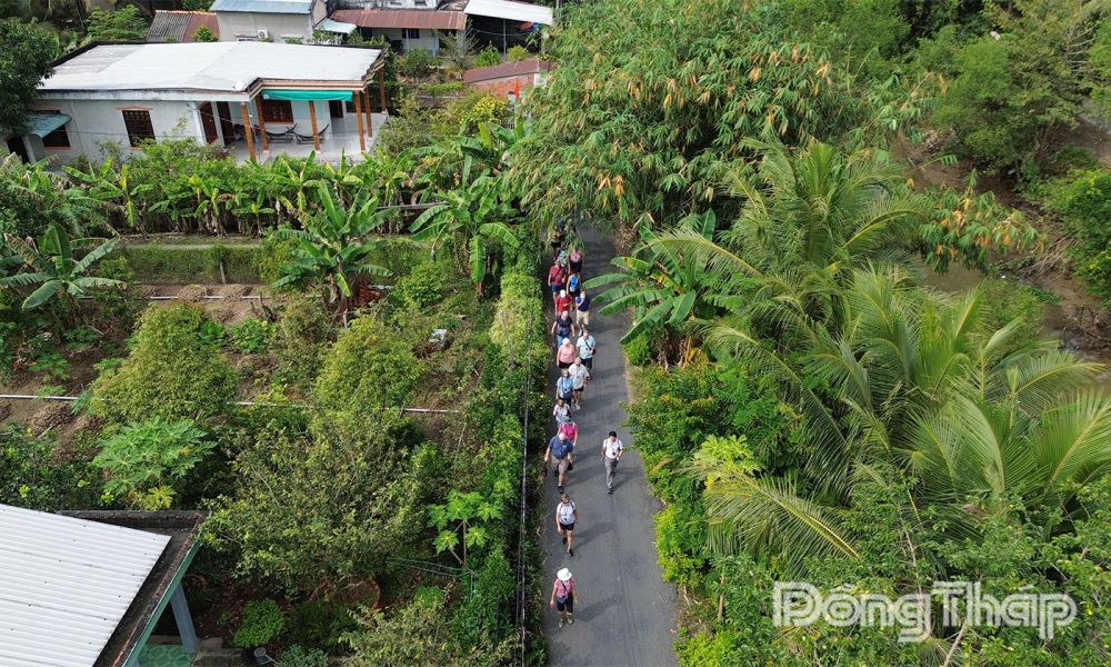 Du khách đi bộ trên những tuyến đường rợp bóng cây xanh để vào Làng cổ Đông Hòa Hiệp vào sáng ngày 2-12.