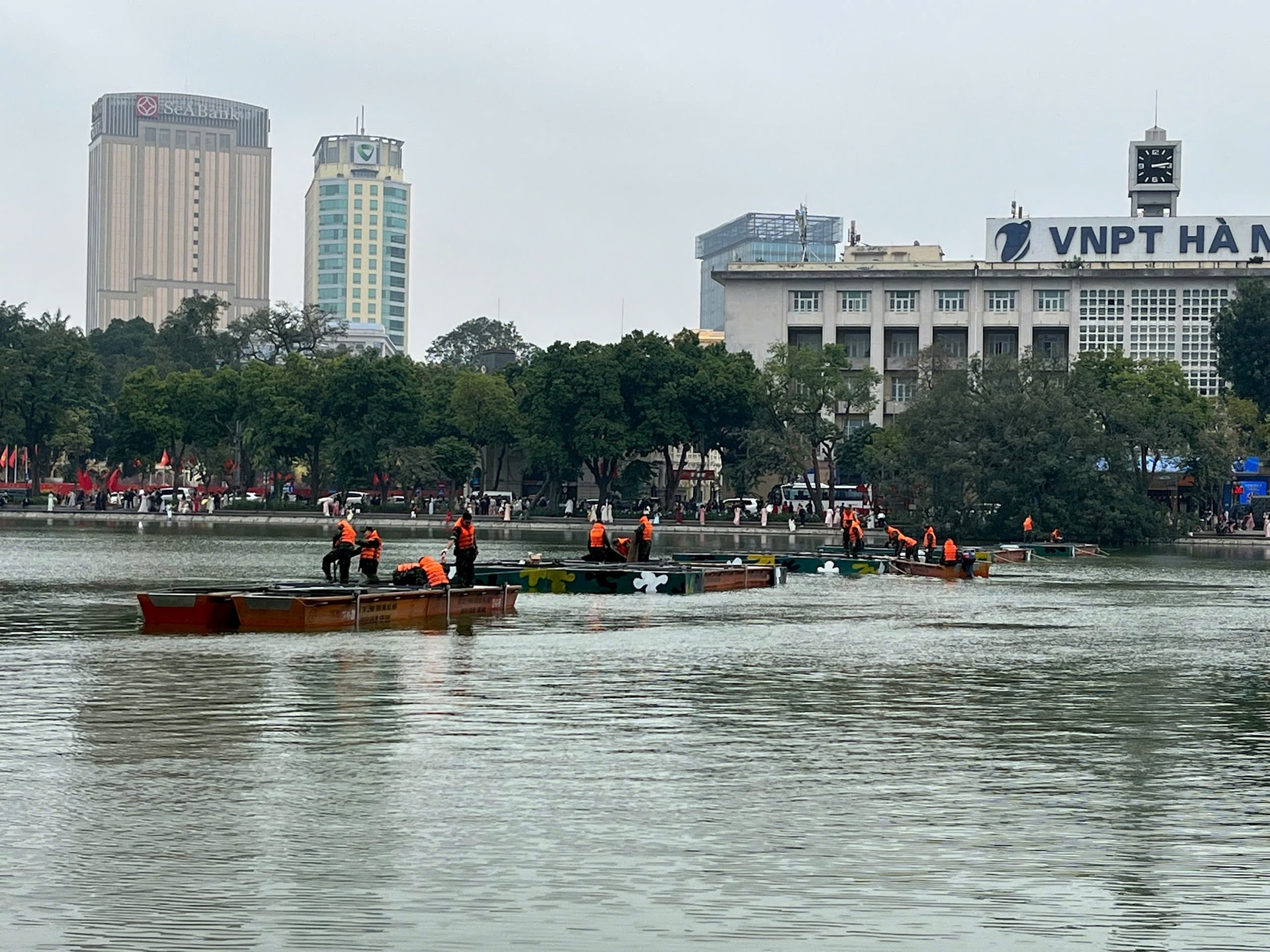 Lực lượng chức năng chuẩn bị trận địa pháo hoa hỏa thuật, tạo hiệu ứng soi bóng tại Hồ Hoàn Kiếm. Ảnh: Nguyên Hoa.