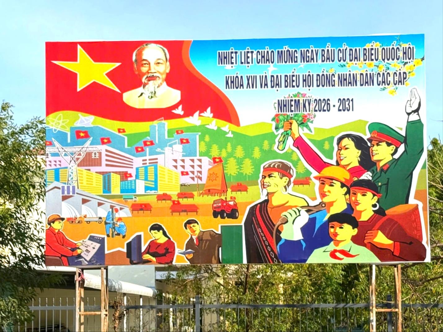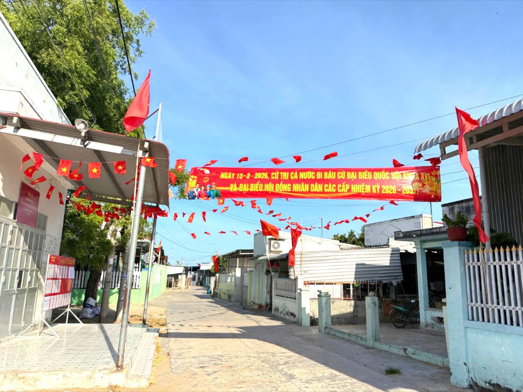 Những ngày này, đi trên các tuyến đường ở Vĩnh Hảo dễ dàng cảm nhận không khí rộn ràng trước ngày bầu cử. Dọc các lối vào thôn, những hàng cờ đỏ sao vàng nối dài trong gió. Từ trụ sở xã, trường học, nhà văn hóa thôn đến các tuyến đường liên thôn, sắc đỏ của cờ Tổ quốc, băng rôn, pa nô, khẩu hiệu tuyên truyền tạo nên một bức tranh sinh động thu hút ánh nhìn người dân.