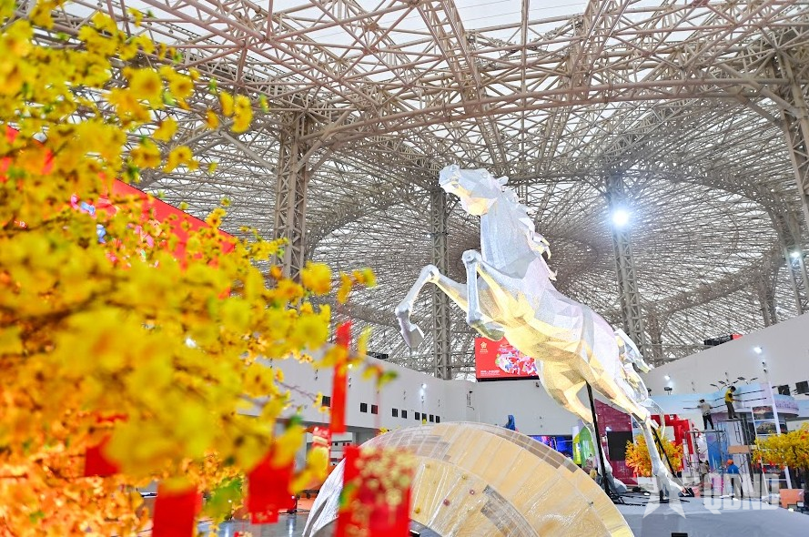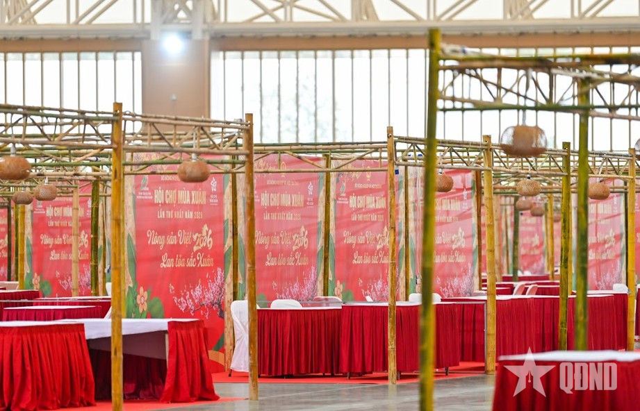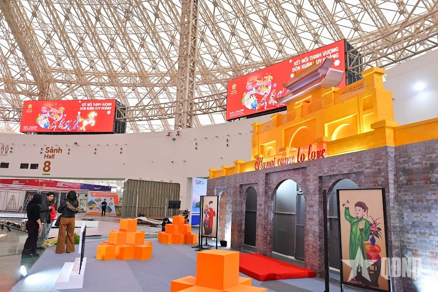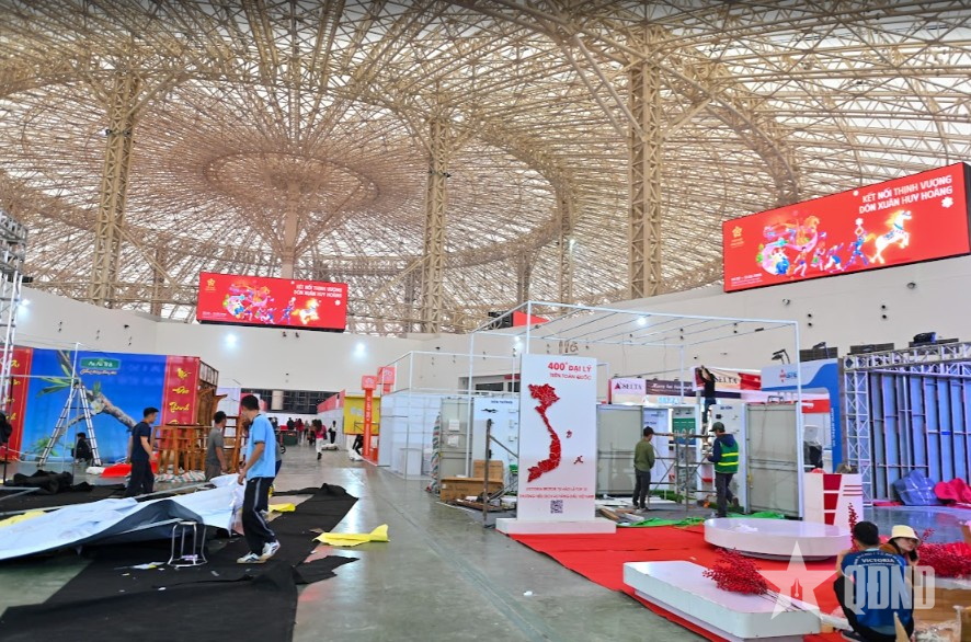 Tại khu vực trung tâm nơi diễn ra các hoạt động trưng bày, quảng bá và kết nối giao thương, hàng trăm công nhân, kỹ sư cùng đội ngũ thiết kế đang tất bật hoàn thiện từng gian hàng. Hệ thống khung sắt, nhà bạt quy mô lớn đã được lắp dựng cơ bản; các hạng mục trang trí, hệ thống điện chiếu sáng, âm thanh, sân khấu chính và khu vực check-in đang được triển khai đồng bộ. Những dãy gian hàng mang sắc xuân rực rỡ dần thành hình, tạo nên diện mạo sinh động cho không gian hội chợ.
