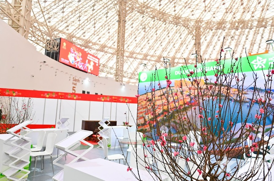 Sắc xuân được điểm xuyết rõ nét qua những nụ đào thắm, hàng mai vàng, câu đối đỏ, mô hình trang trí chủ đề và các không gian trải nghiệm Tết tại Hội chợ Mùa xuân lần thứ nhất năm 2026.