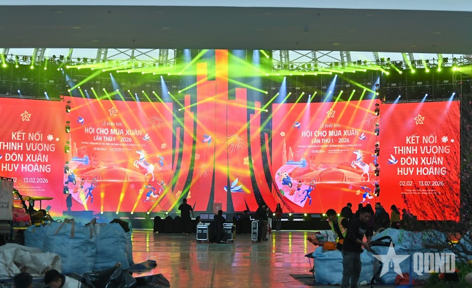 Sân khấu trung tâm bước vào giai đoạn lắp đặt, chạy thử hệ thống âm thanh, ánh sáng phục vụ lễ khai mạc Hội chợ Mùa xuân lần thứ nhất năm 2026.