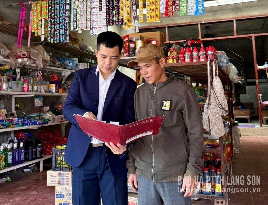Cán bộ Agribank Lộc Bình Lạng Sơn tuyên truyền, hướng dẫn hộ kinh doanh trên địa bàn xã Thống Nhất các nội dung liên quan đến chuyển đổi thuế và chính sách ưu đãi của ngân hàng