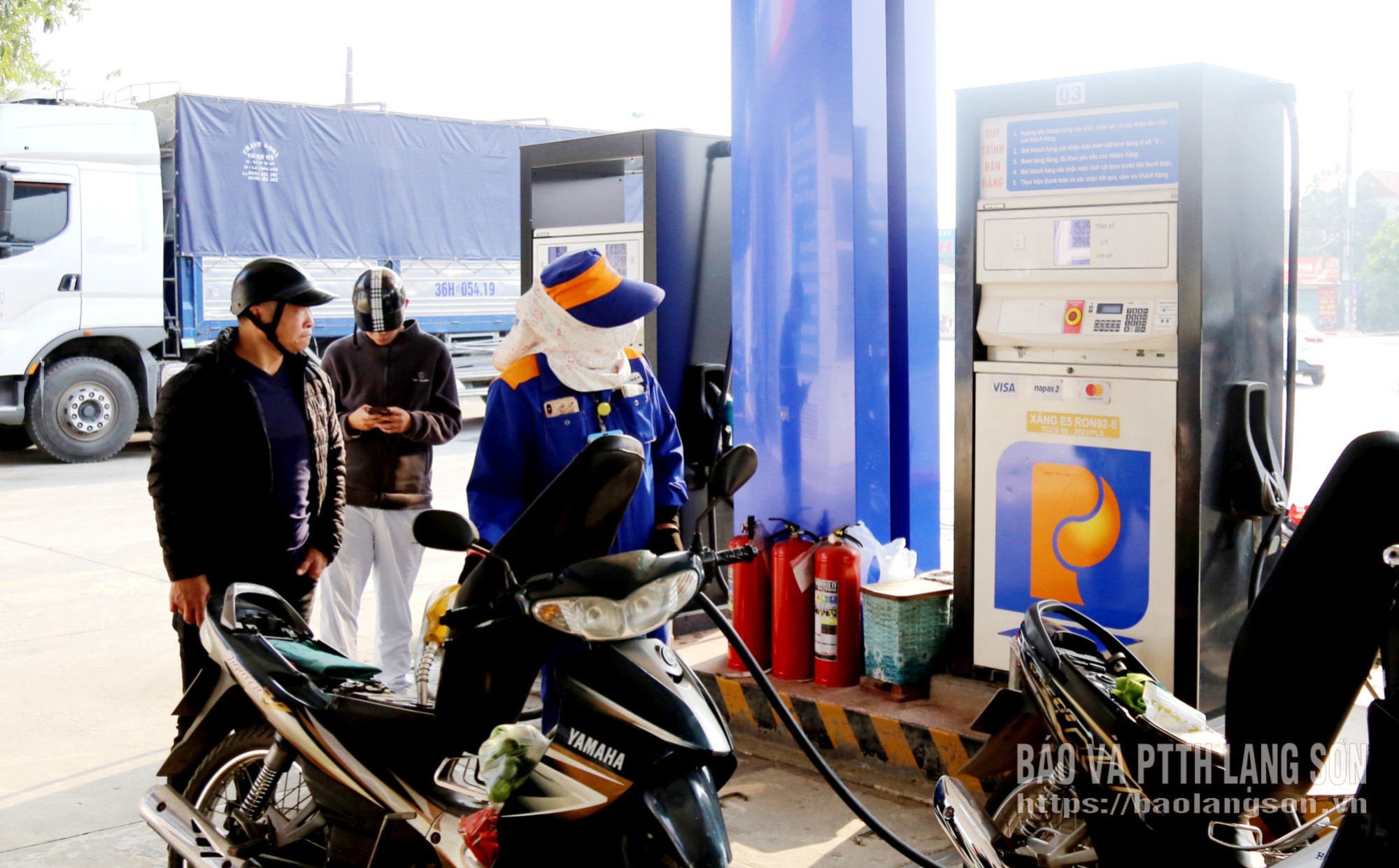 Nhân viên cửa hàng số 8 - Công ty TNHH MTV Petrolimex Lạng Sơn bán xăng cho khách hàng