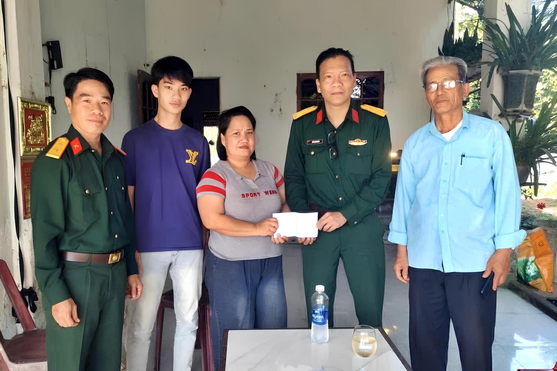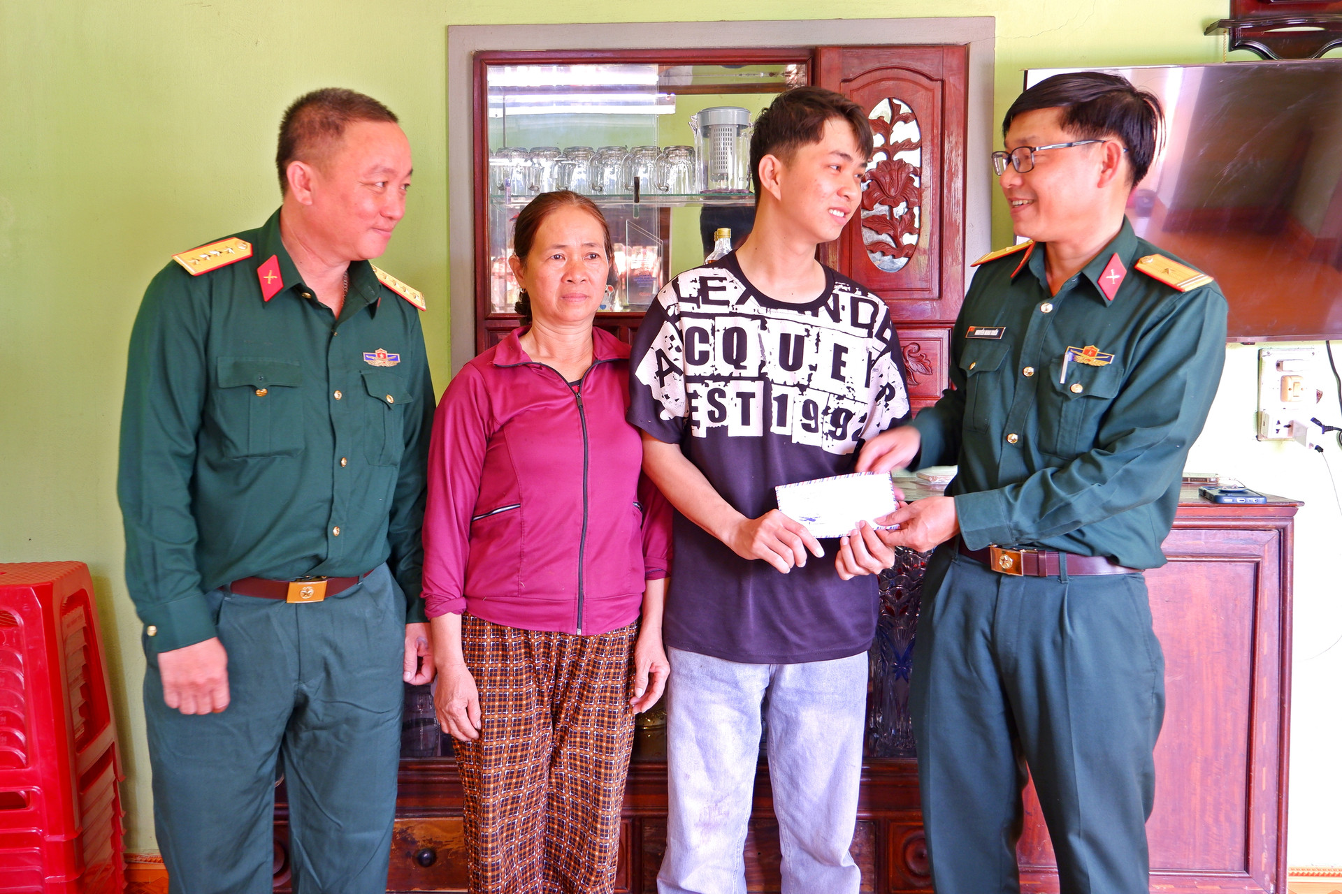 Ban Chỉ huy Quân sự xã Hòa Vang thăm hỏi, động viên người thân của thanh niên Nguyễn Trung Nhân giúp em an tâm nhập ngũ. Ảnh: TRẦN HỮU