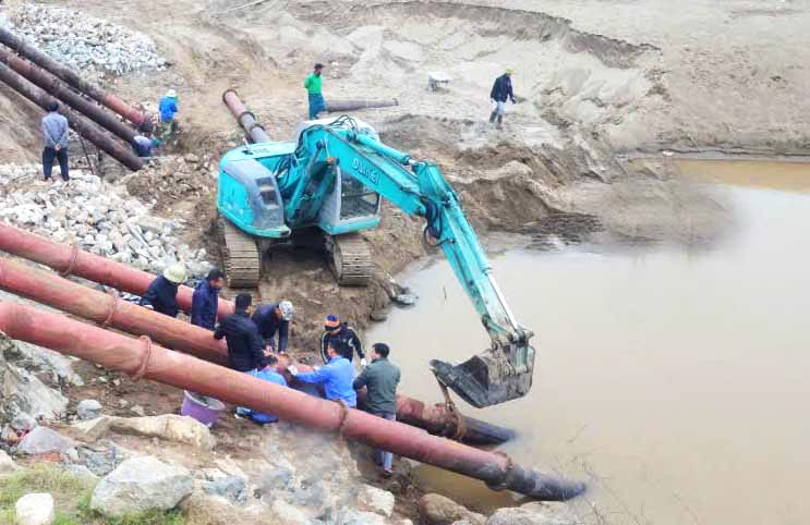 Công nhân Xí nghiệp Thủy lợi Ba Vì nạo vét lòng dẫn lấy nước sông Đà tại Trạm bơm dã chiến Sơn Đà.