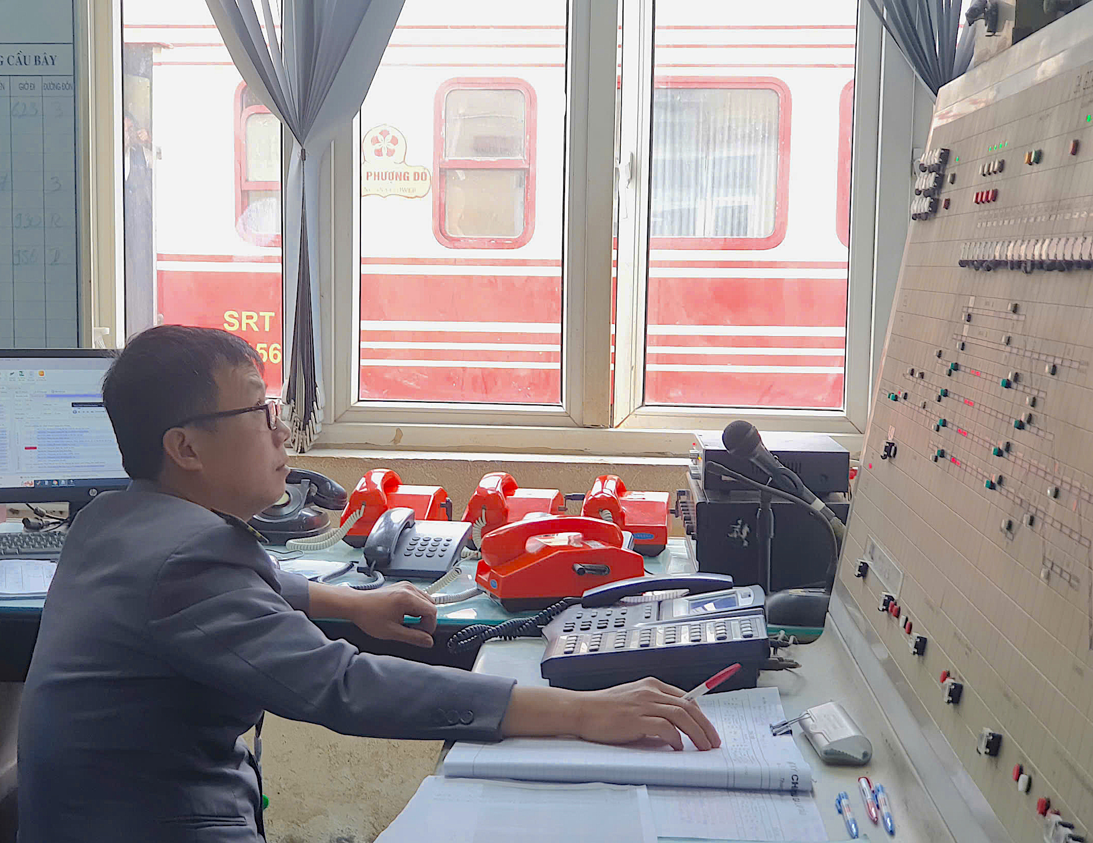 Trung tuần tháng 1/2026, tại ga Gia Lâm, các bộ phận từ trực ban chạy tàu, gác ghi… chuẩn bị đón đoàn tàu hàng thông qua ga. Nhân viên trực ban chạy tàu nhận thông tin từ ga bên cạnh, rồi báo cho nhân viên gác chắn đường ngang qua tổng đài chuyên dụng đường sắt, vừa theo dõi trạng thái đường ga trên đài khống chế.