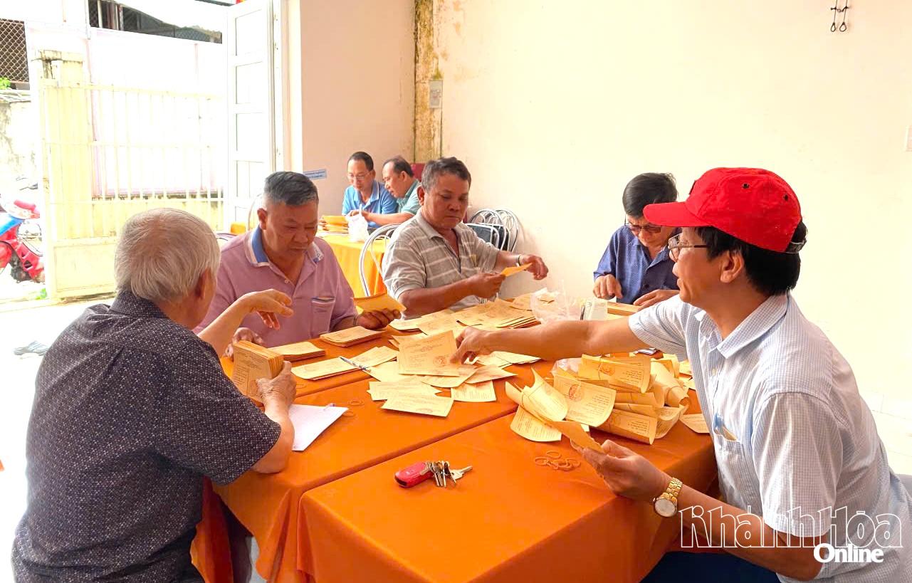 Thành viên Tổ bầu cử số 10 phường Tây Nha Trang sắp xếp thẻ cử tri để phát cho người dân. Ảnh: Văn Giang