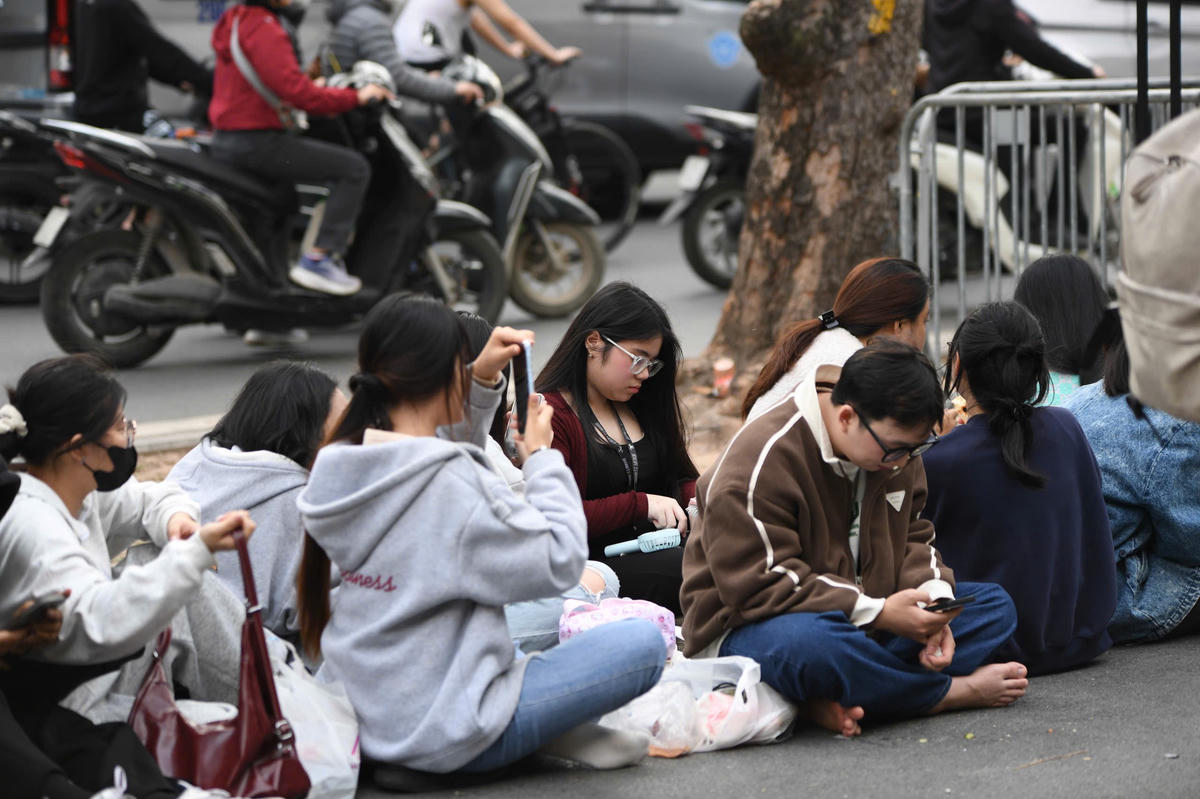Nhiều nhóm bạn trẻ mang theo đồ ăn nhẹ, nước uống, xếp hàng từ sớm để “giữ chỗ”, chọn được góc nhìn ưng ý nhất cho đại tiệc đếm ngược. Ảnh: Phạm Sỹ.