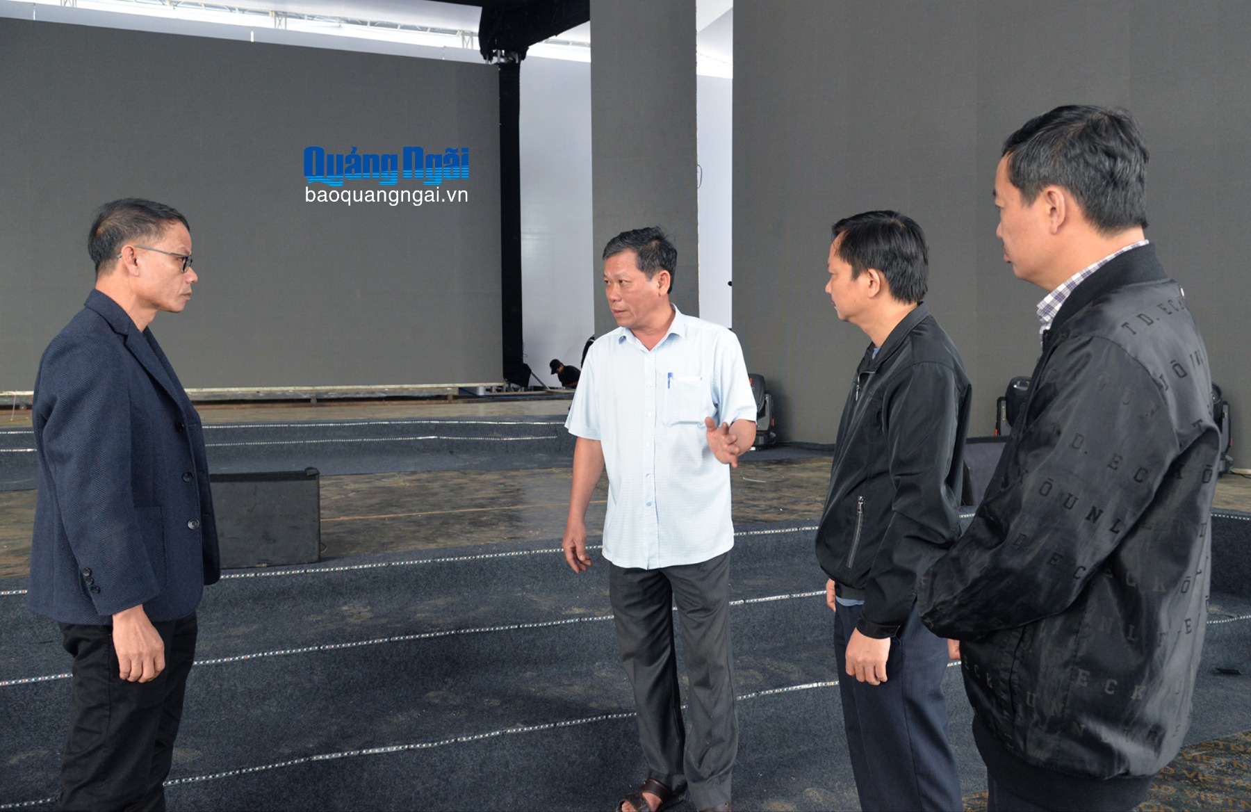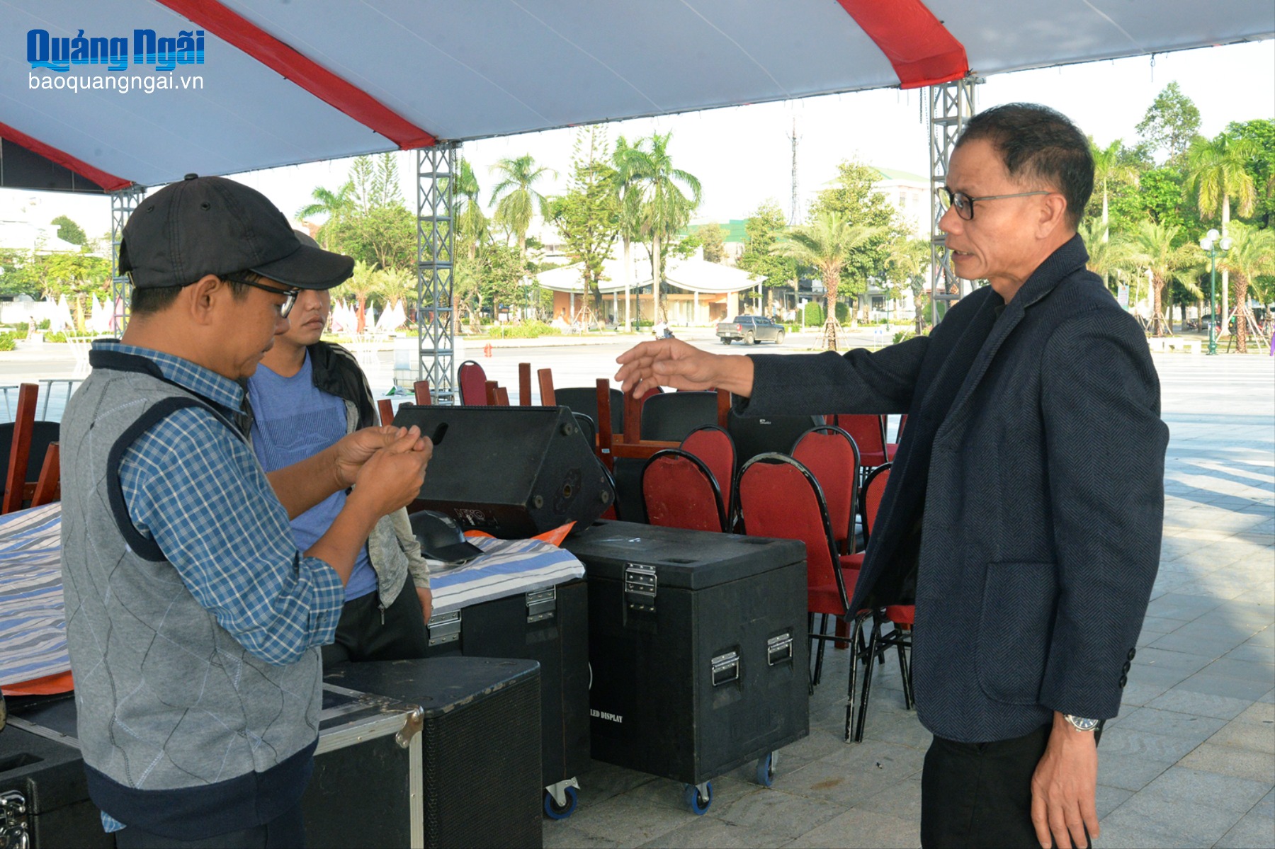 Lãnh đạo Báo và Phát thanh, Truyền hình Quảng Ngãi kiểm tra công tác chuẩn bị phát sóng trực tiếp tại điểm cầu Quảng trường đường Phạm Văn Đồng.