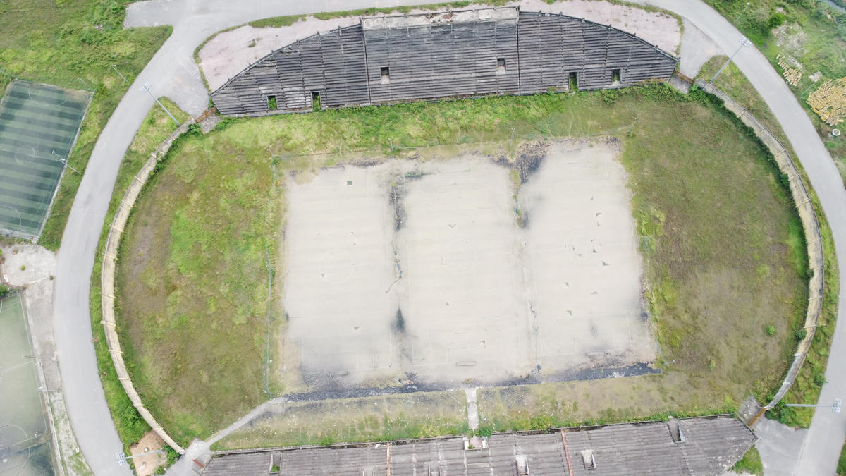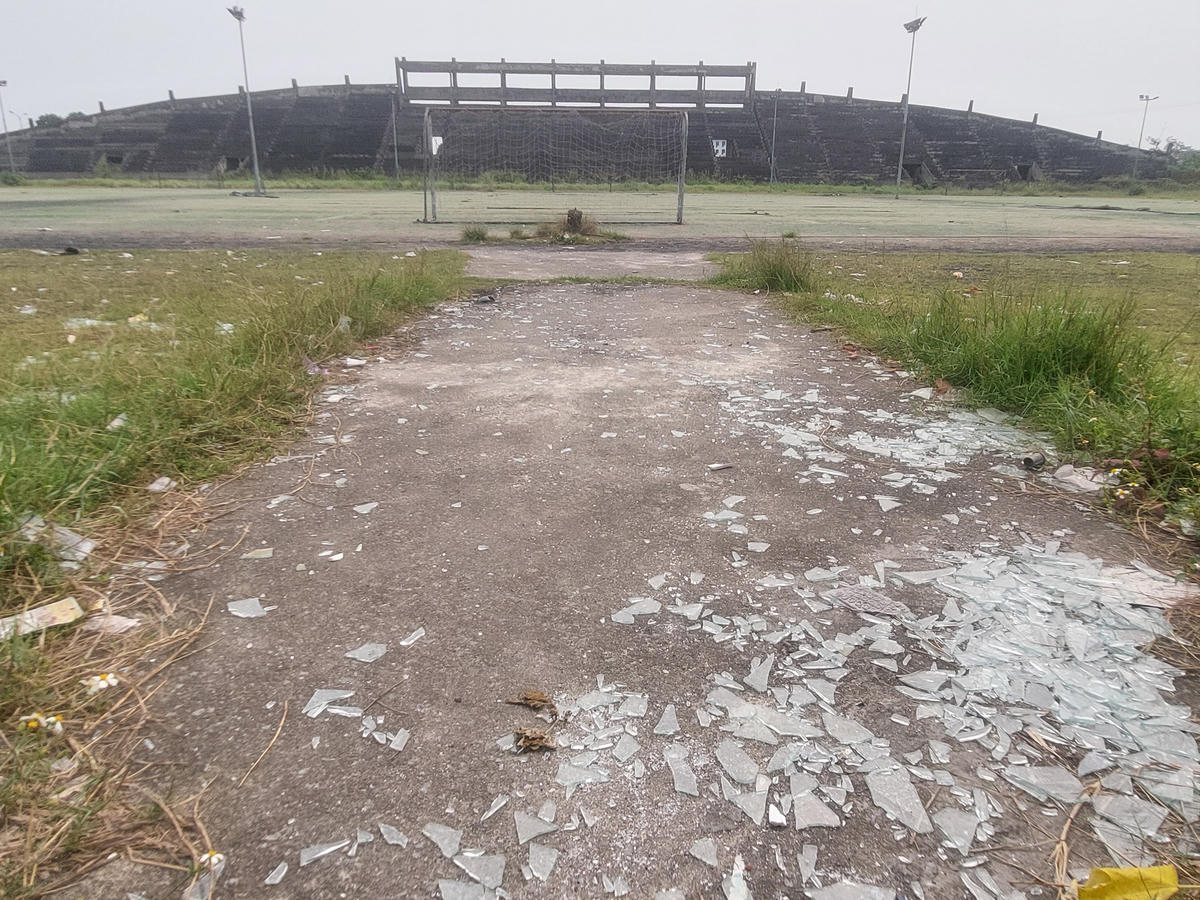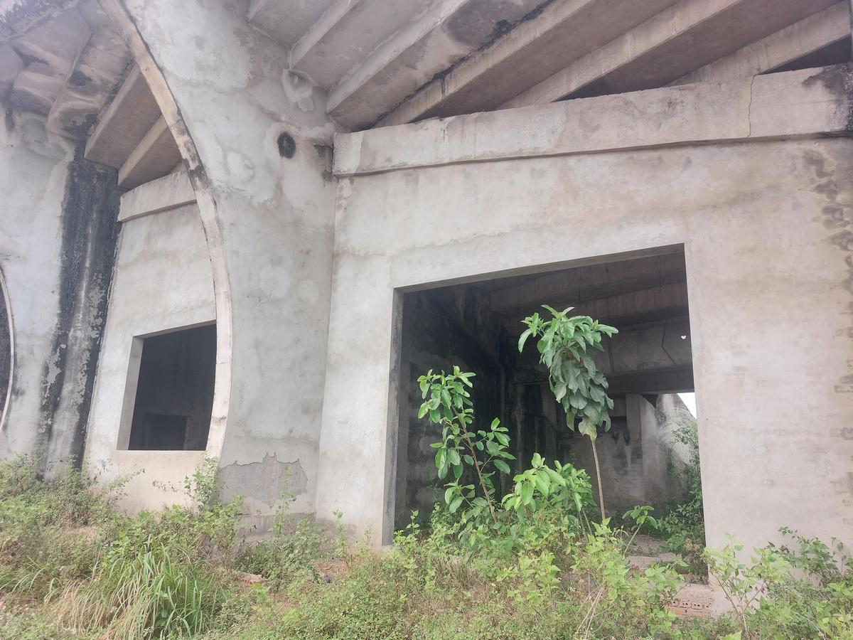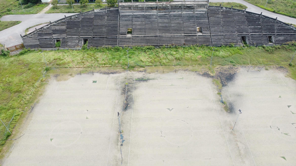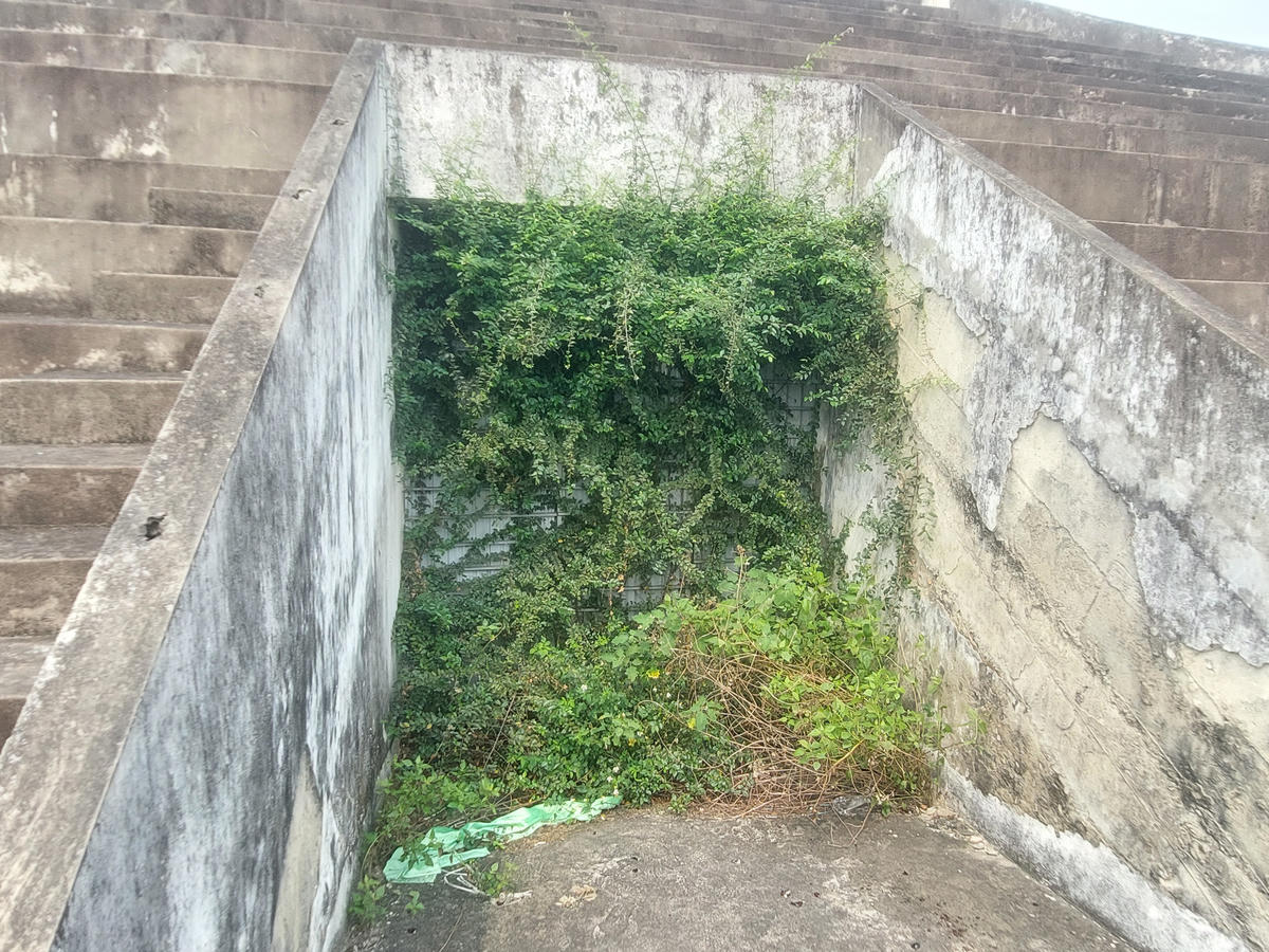 Khán đài dang dở, bê tông phơi mưa nắng xuống cấp theo thời gian.