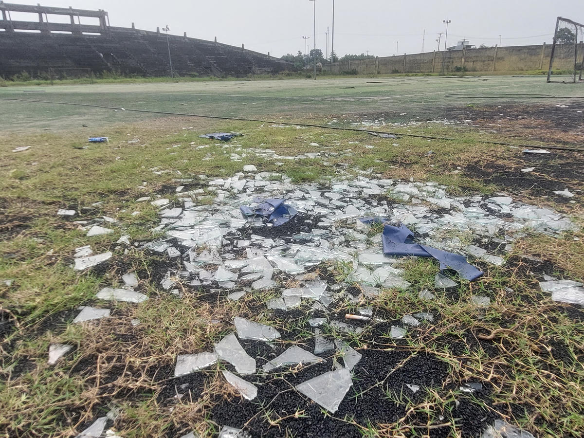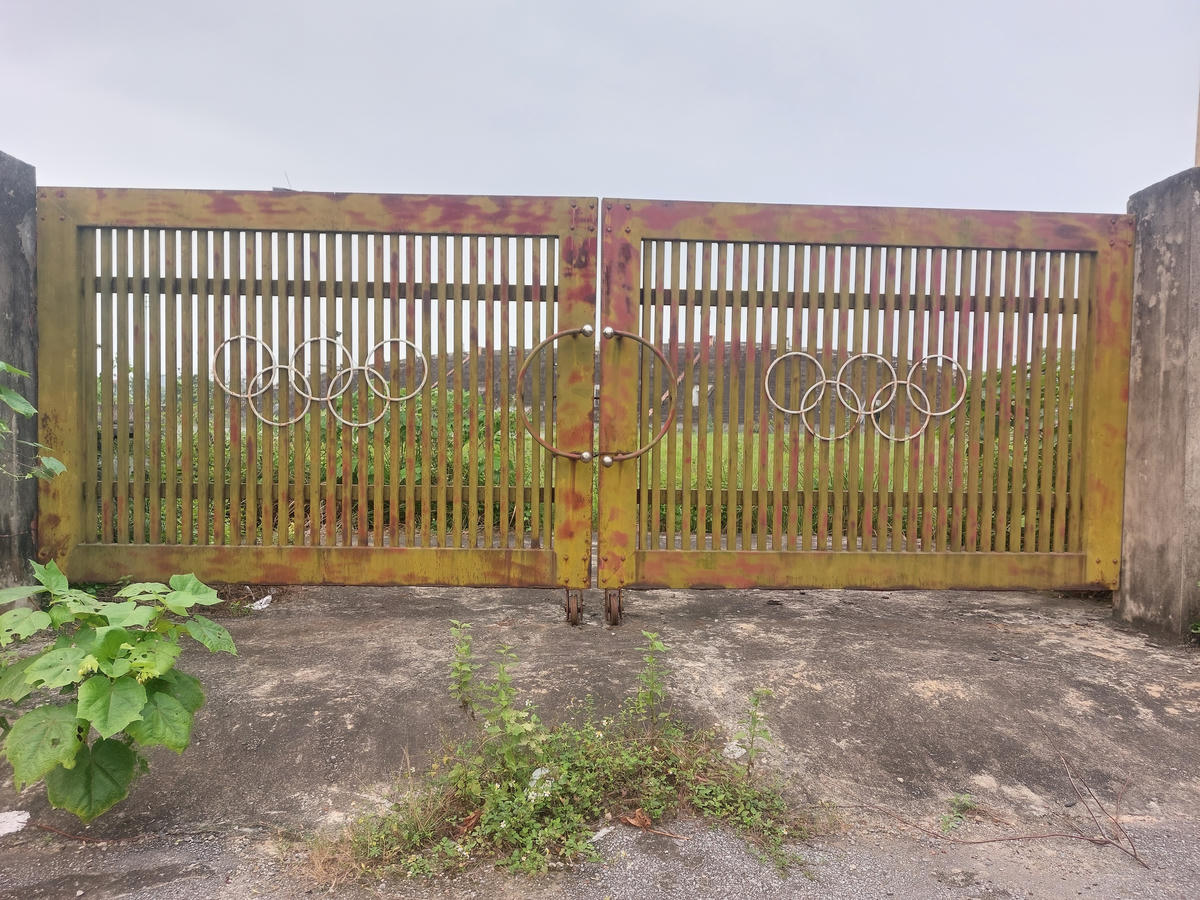 Lối ra vào sân vận động hoang vắng, không dấu hiệu hoạt động.