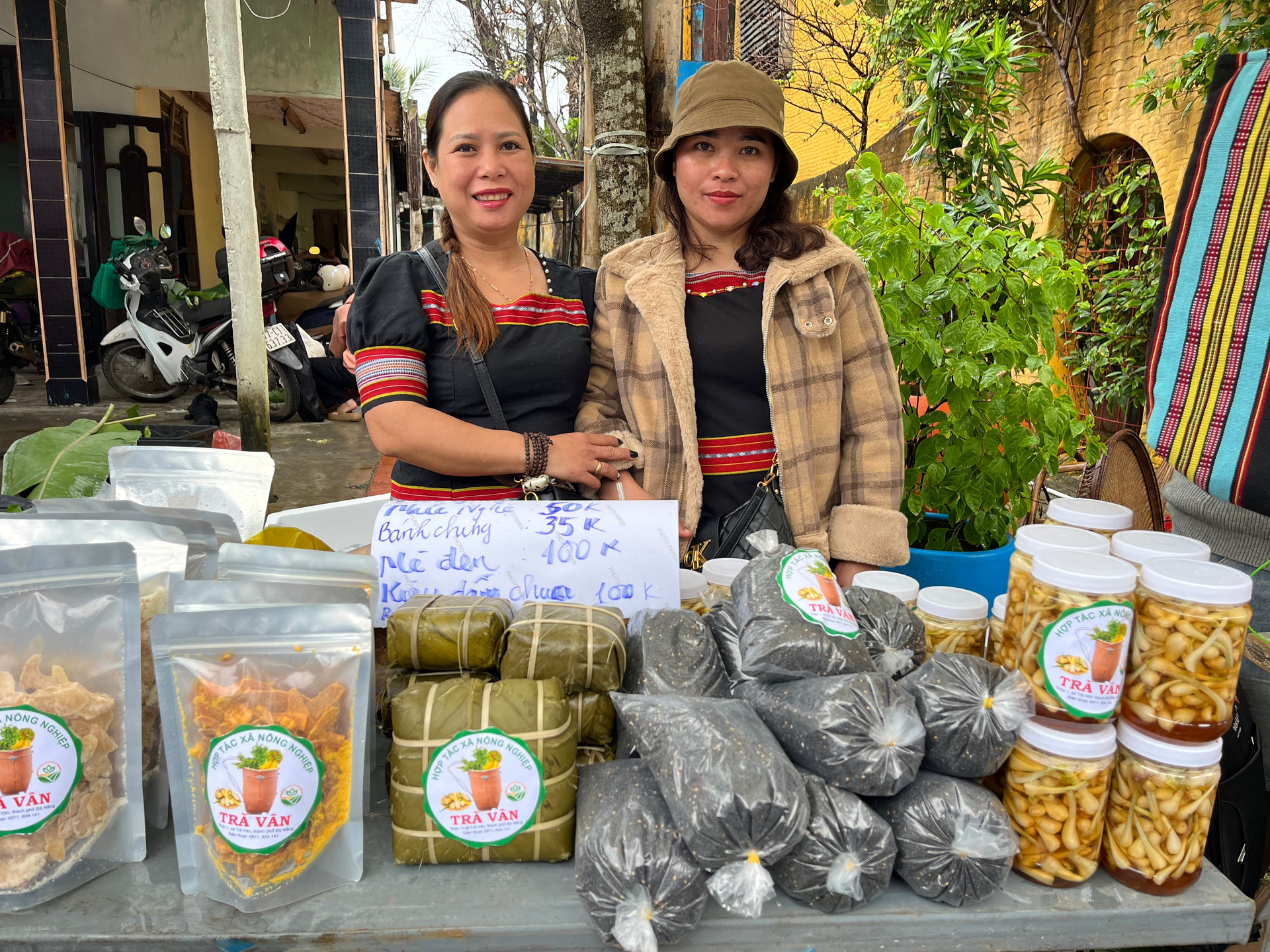 Từ núi về biển, các thành viên Hợp tác xã nông nghiệp Trà Vân (thôn 4, xã Trà Vân) hối hả bày biện, giới thiệu đến du khách trong và ngoài nước những mặt hàng do hợp tác xã sản xuất, với thịt heo gác bếp, mứt gừng, mứt nghệ, mè đen, bánh chưng lá dong, rượu thủ công…