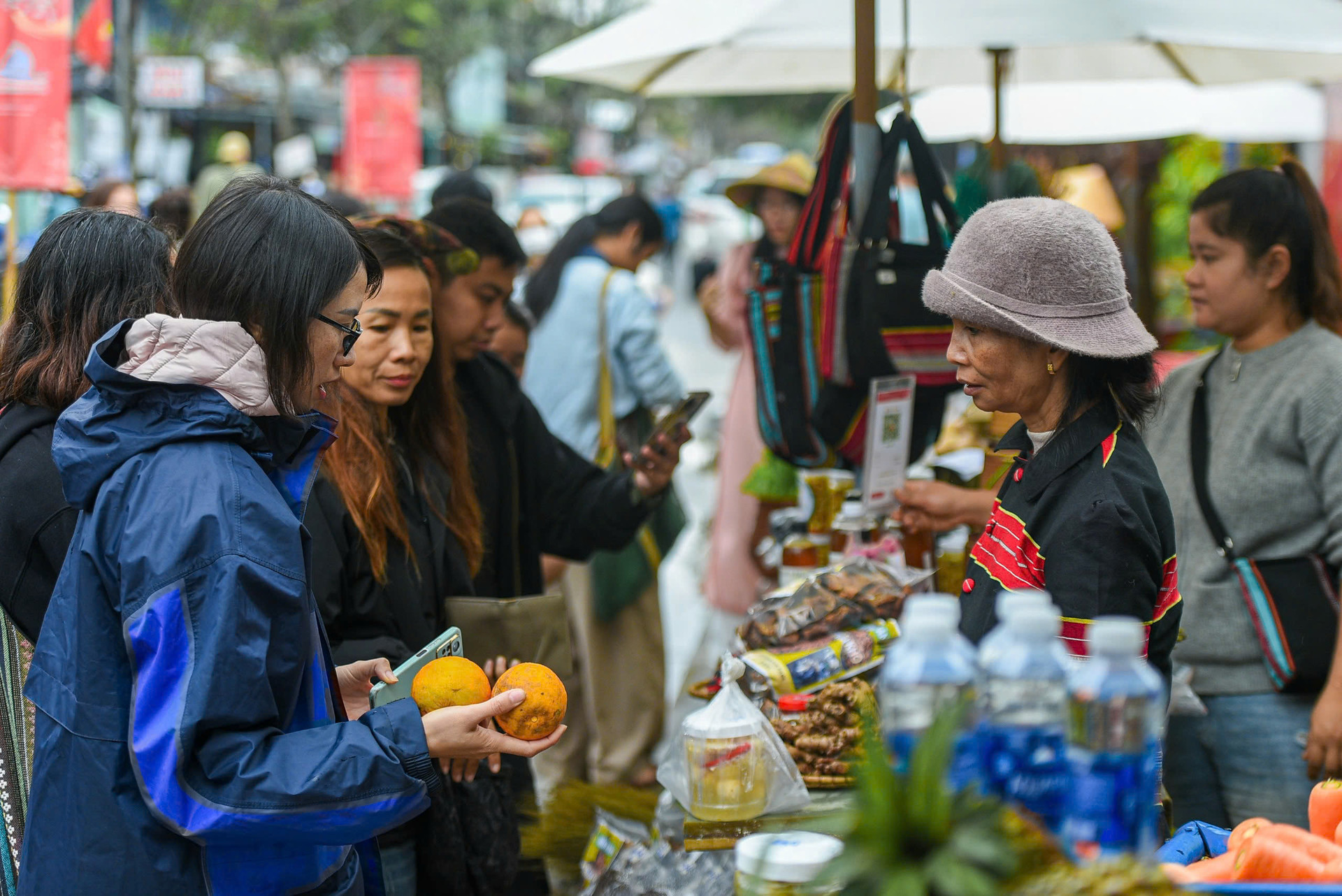Du khách tìm mua nông sản tại phiên chợ vùng cao do khu du lịch Leaf Village & Farm - Làng Lá (phường Hải Vân) tổ chức. Ảnh: XUÂN SƠN
