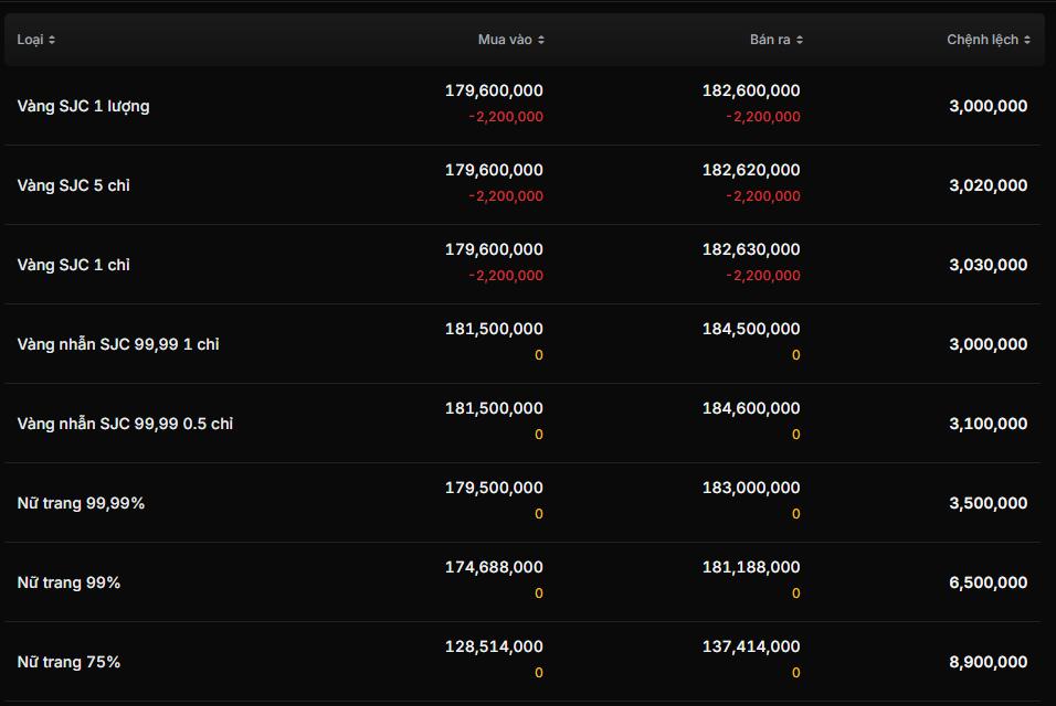 Cụ thể, theo bảng giá cập nhật lúc 9 giờ của Công ty Vàng bạc đá quý Sài Gòn (SJC), giá vàng miếng SJC 1 lượng đã chính thức lao dốc 2,2 triệu đồng/lượng ở cả hai chiều mua và bán so với thời điểm mở cửa. Mức giá niêm yết mới rơi thẳng xuống vùng 179,6 - 182,6 triệu đồng/lượng (mua vào - bán ra).