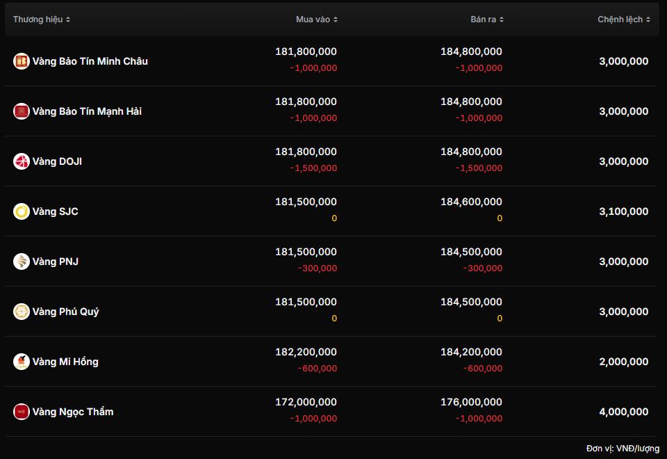 Trái ngược với đà giảm sốc của SJC, các doanh nghiệp kinh doanh vàng lớn khác trên thị trường dường như vẫn đang án binh bất động, giữ nhịp độ của phiên mở cửa đầu ngày. Tại Tập đoàn DOJI, vàng miếng giữ mức 181,85 - 184,90 triệu đồng/lượng. Các thương hiệu như Bảo Tín Minh Châu, PNJ, Phú Quý tiếp tục neo ở mốc 181,8 - 184,8 triệu đồng/lượng. Tại khu vực TP Hồ Chí Minh, hệ thống Mi Hồng báo giá 182,2 - 184,2 triệu đồng/lượng.