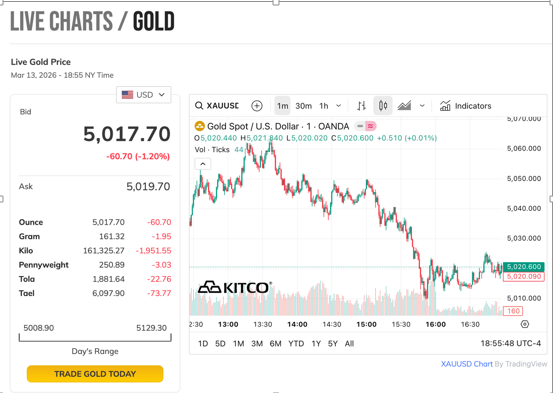 Diễn biến sụt giảm bất ngờ của vàng SJC trong nước sáng nay diễn ra trong bối cảnh thị trường quốc tế đang chịu nhiều áp lực đè nén. Trong phiên giao dịch cuối ngày 13/3 theo giờ New York (tức sáng 14/3 theo giờ Việt Nam), giá vàng thế giới tiếp tục nhịp điều chỉnh lùi sâu. Dữ liệu trên Kitco ghi nhận kim loại quý dao động trong biên độ 5.008,9 - 5.129,3 USD/ounce. Cập nhật đến đầu giờ sáng 14/3, giá vàng giao ngay (XAU/USD) tiếp tục giảm 1,2%, neo sát mốc 5.019,25 USD/ounce.