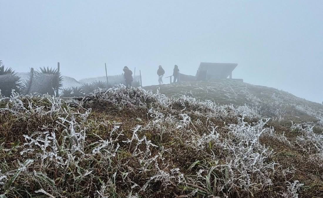 Băng giá phủ trắng đỉnh Mẫu Sơn (Lạng Sơn) do nhiệt độ xuống thấp. Ảnh: MXH