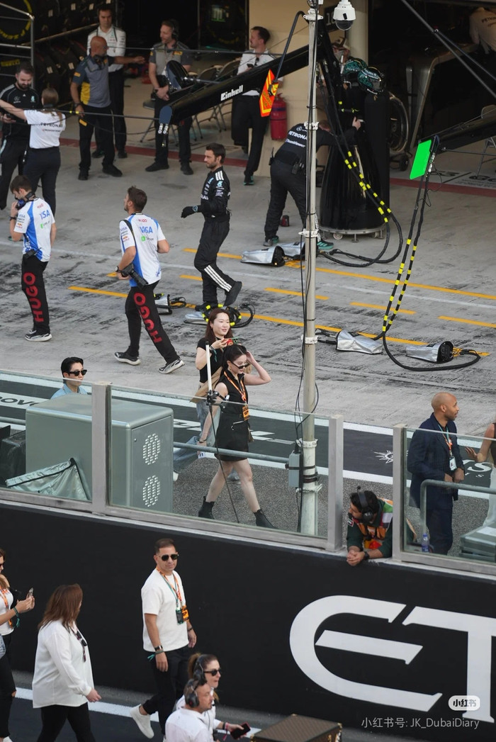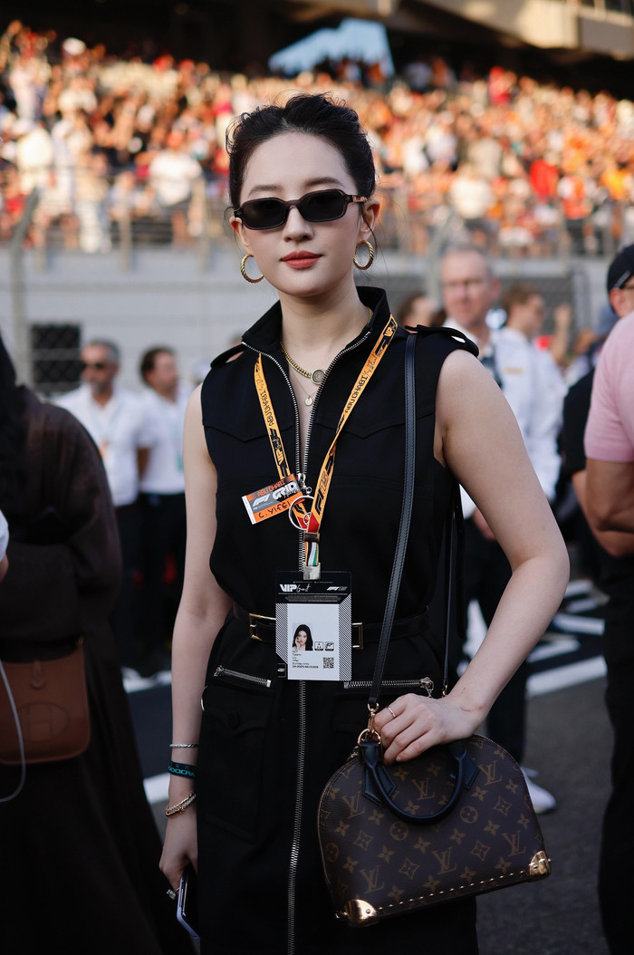 Cụ thể khi đi xem đua xe, nữ diễn viên đã buộc cao mái tóc đen dài, diện váy đen dáng công sở và đeo bộ trang sức vàng 18K lấp lánh, Lưu Diệc Phi được khen toát lên phong thái "sang – xịn – mịn".