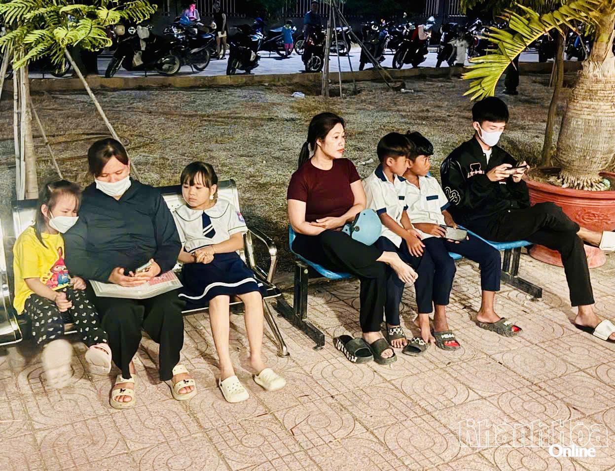 Phụ huynh và học sinh chờ làm thủ tục cấp căn cước, định danh điện tử vào buổi tối tại trụ sở Công an xã Ninh Phước.