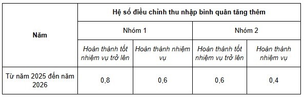 Hệ số điều chỉnh thu nhập bình quân tăng thêm được tính theo lần mức lương ngạch bậc, chức vụ hoặc mức lương theo vị trí việc làm, chức danh, chức vụ lãnh đạo, thực hiện như sau: