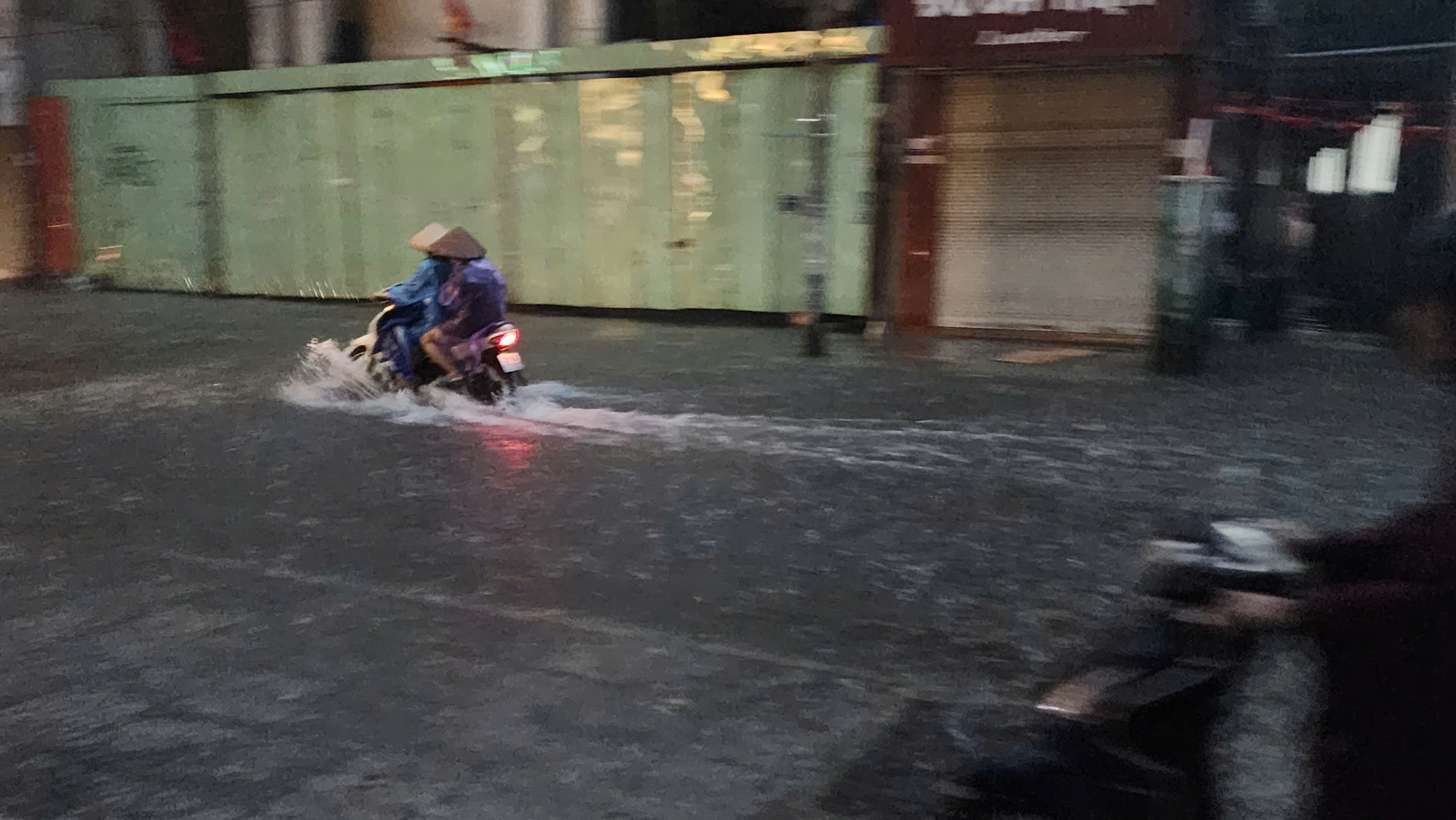 Mưa to kéo dài suốt đêm khiến tuyến phố Đội Cấn bị ngập sâu. Ảnh: VIỆT ANH