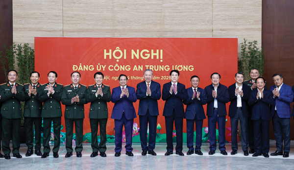 Tổng Bí thư Tô Lâm, Chủ tịch nước Lương Cường, Thủ tướng Chính phủ Phạm Minh Chính với các đại biểu dự Hội nghị Đảng ủy Công an Trung ương năm 2025 (ngày 4/12/2025).