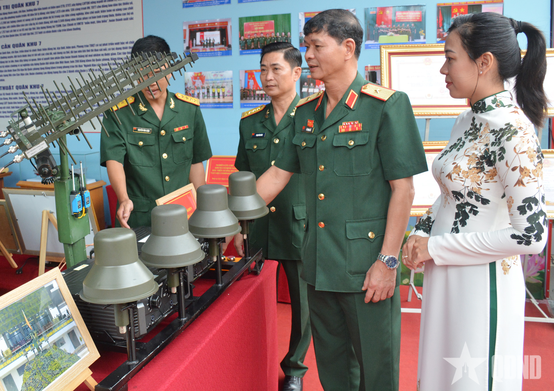 Thiếu tướng Lê Ngọc Hải, Phó tham mưu trưởng Quân khu 7 và các đại biểu tham quan mô hình sáng kiến.