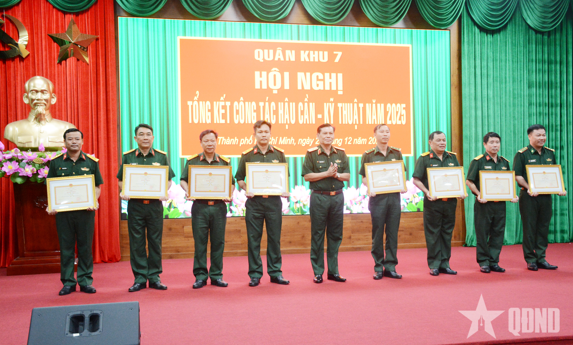 Thiếu tướng Đặng Văn Lẫm, Phó tư lệnh Quân khu 7 trao thưởng tặng các tập thể, cá nhân hoàn thành tốt nhiệm vụ hậu cần - kỹ thuật năm 2025.