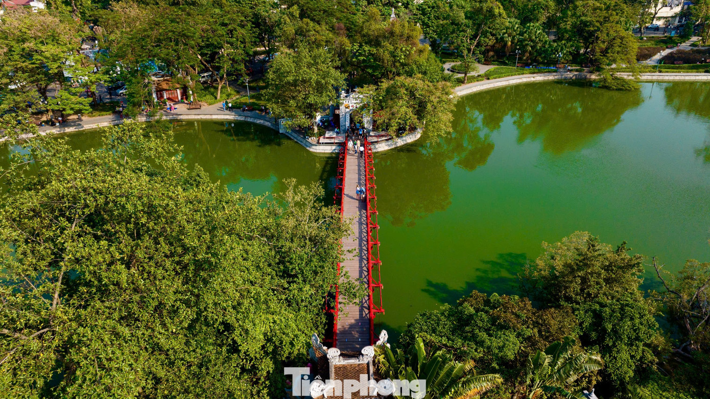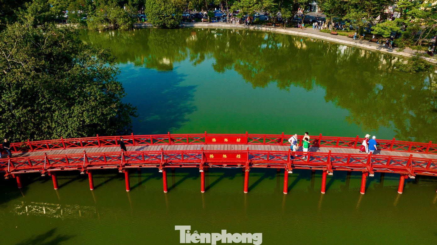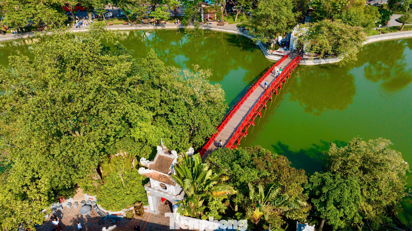 Từ góc nhìn trên cao, Hồ Gươm như ôm trọn hơi thở của Hà Nội. Cầu Thê Húc đỏ thắm nổi bật giữa nền xanh tĩnh lặng, gợi nhịp sống dịu dàng của Thủ đô buổi sớm.