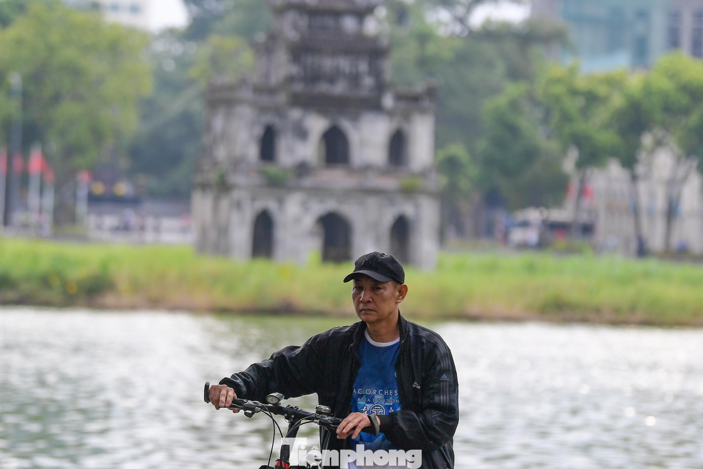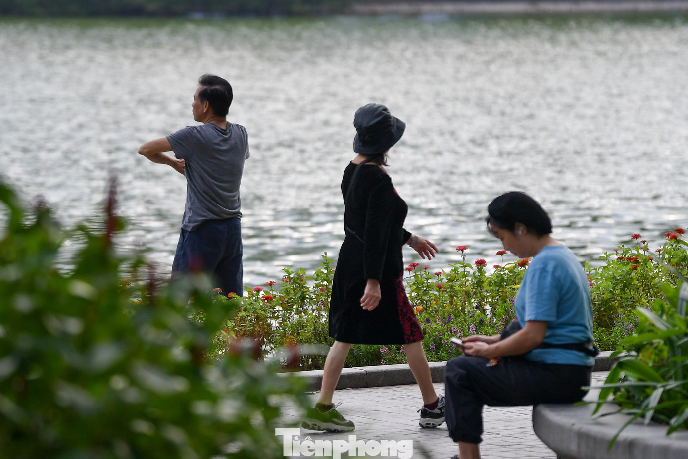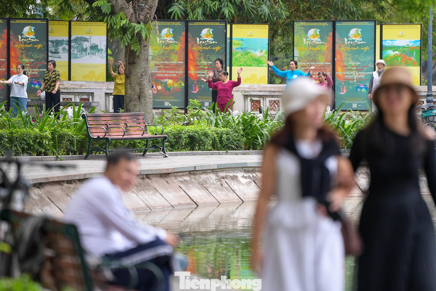 Ở góc đường Lê Thái Tổ, cụ ông Nguyễn văn Minh (67 tuổi, phường Hoàn Kiếm) đang tập dưỡng sinh. “Sáng nào tôi cũng ra hồ, tập vài động tác rồi ngồi nghỉ ngắm người qua lại. Không khí mát lành, dễ chịu lắm, cảm giác như trẻ lại”, cụ chia sẻ.