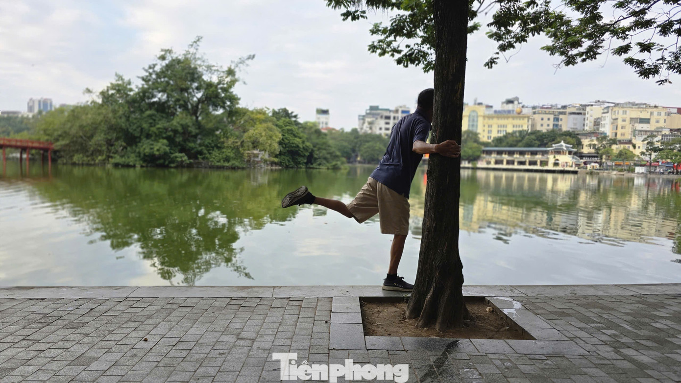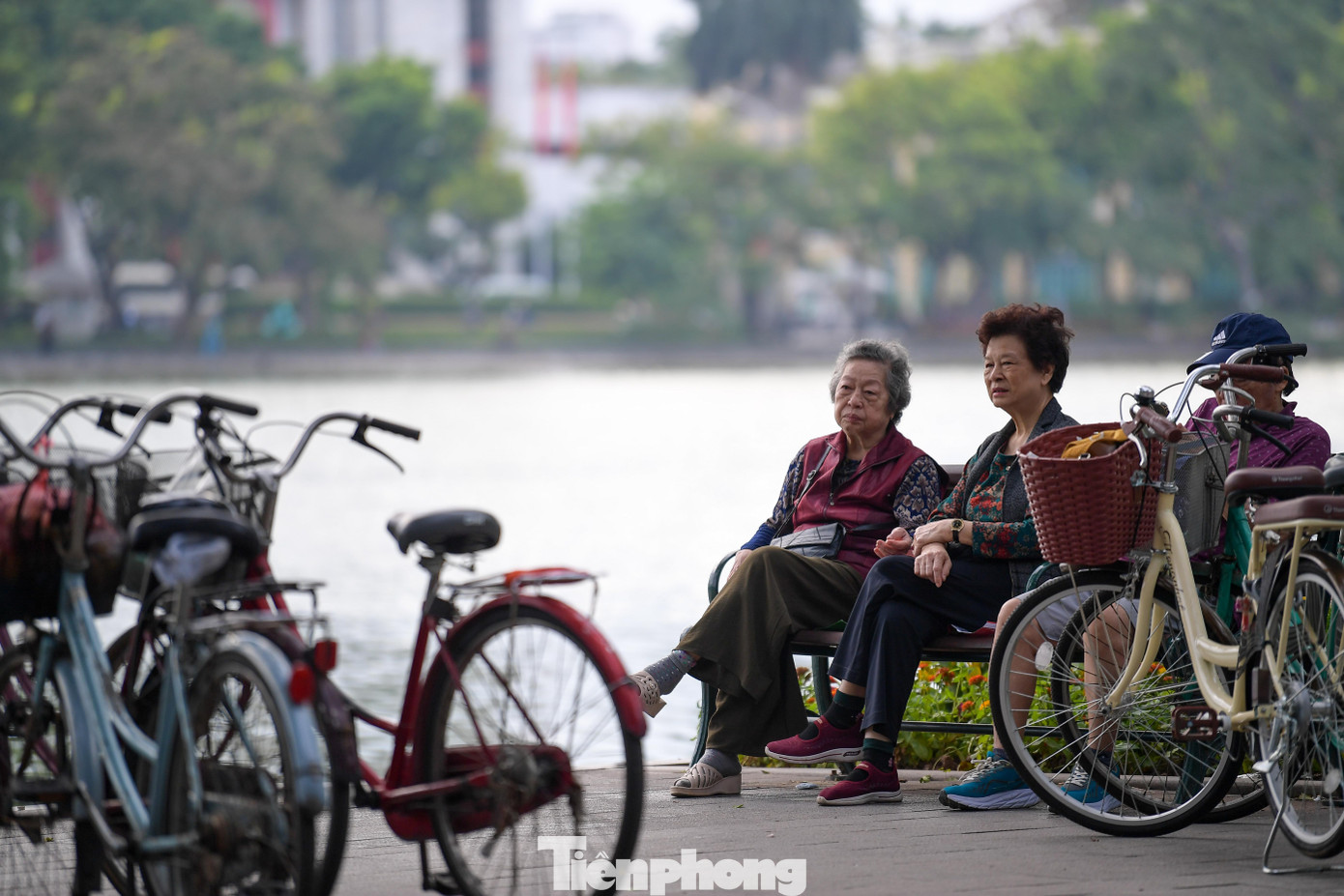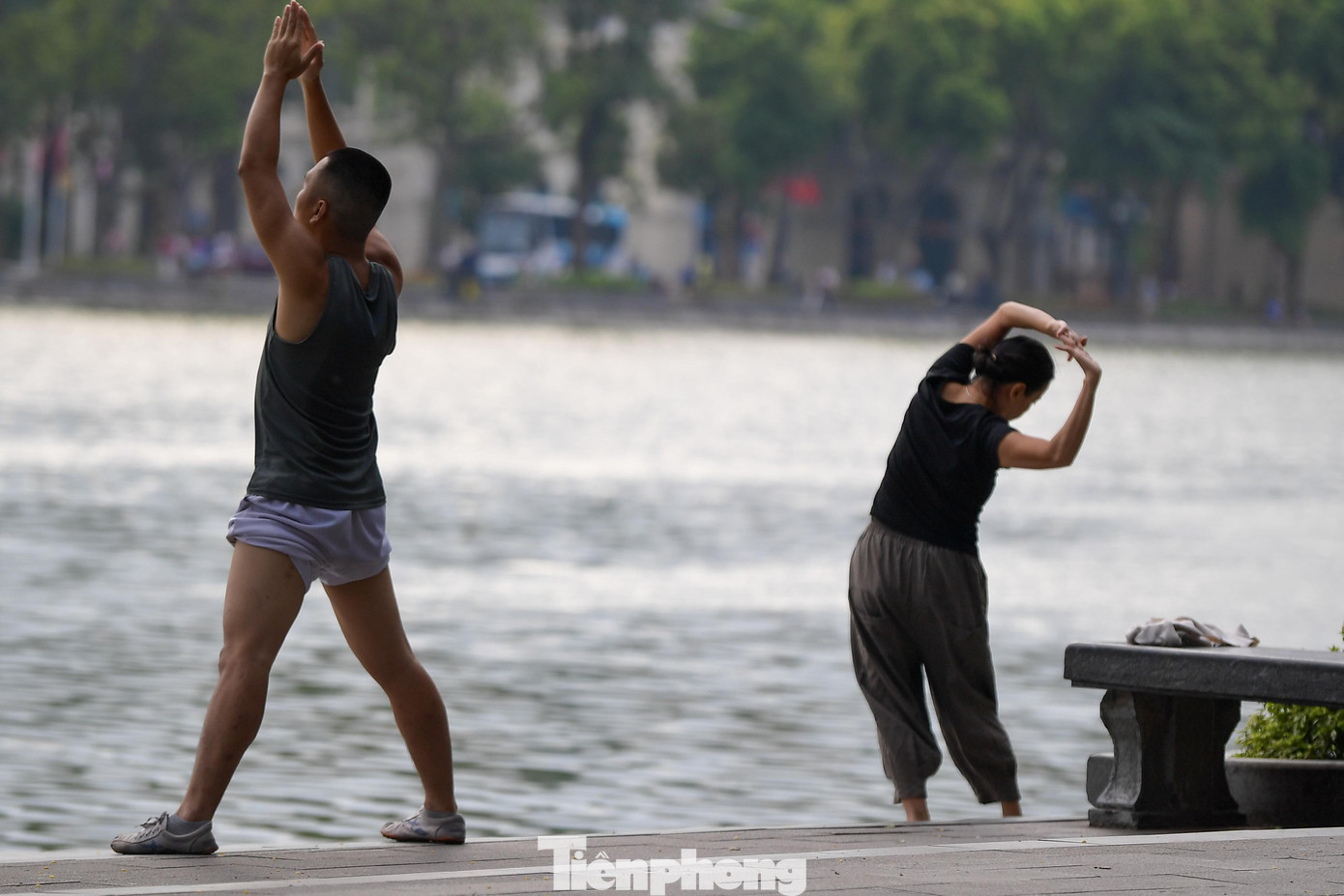 Ở góc đường Lê Thái Tổ, cụ ông Nguyễn văn Minh (67 tuổi, phường Hoàn Kiếm) đang tập dưỡng sinh. “Sáng nào tôi cũng ra hồ, tập vài động tác rồi ngồi nghỉ ngắm người qua lại. Không khí mát lành, dễ chịu lắm, cảm giác như trẻ lại”, cụ chia sẻ.