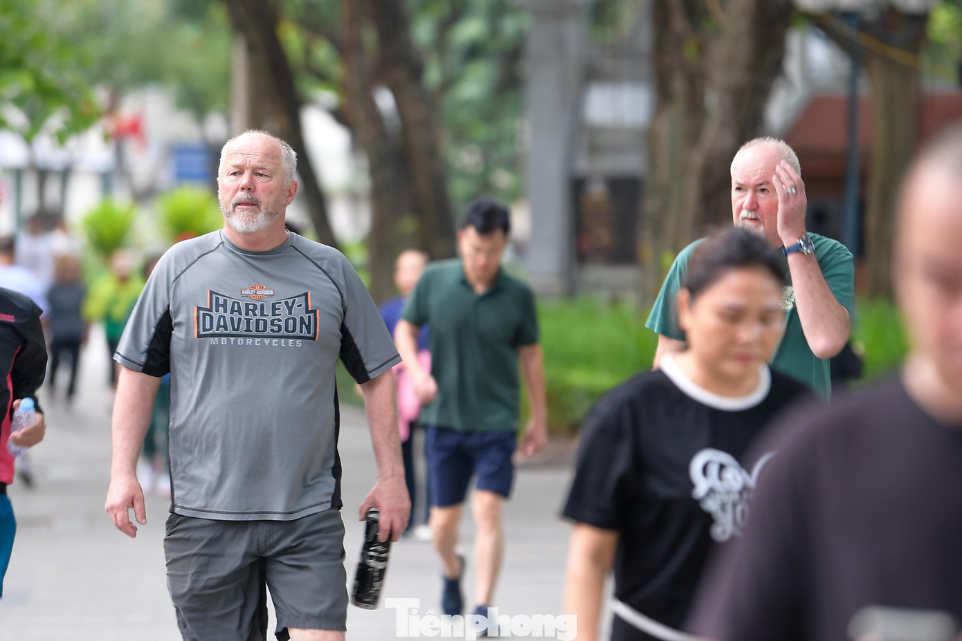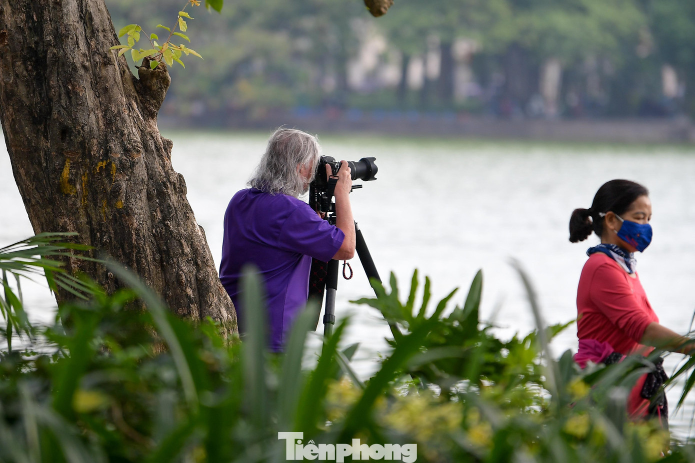 Cách đó không xa, một du khách nước ngoài chăm chú ghi lại khoảnh khắc đẹp của Hồ Gươm sáng sớm. Họ nhìn dòng người đi bộ, thi thoảng giơ máy ảnh chụp một khung cảnh đẹp.